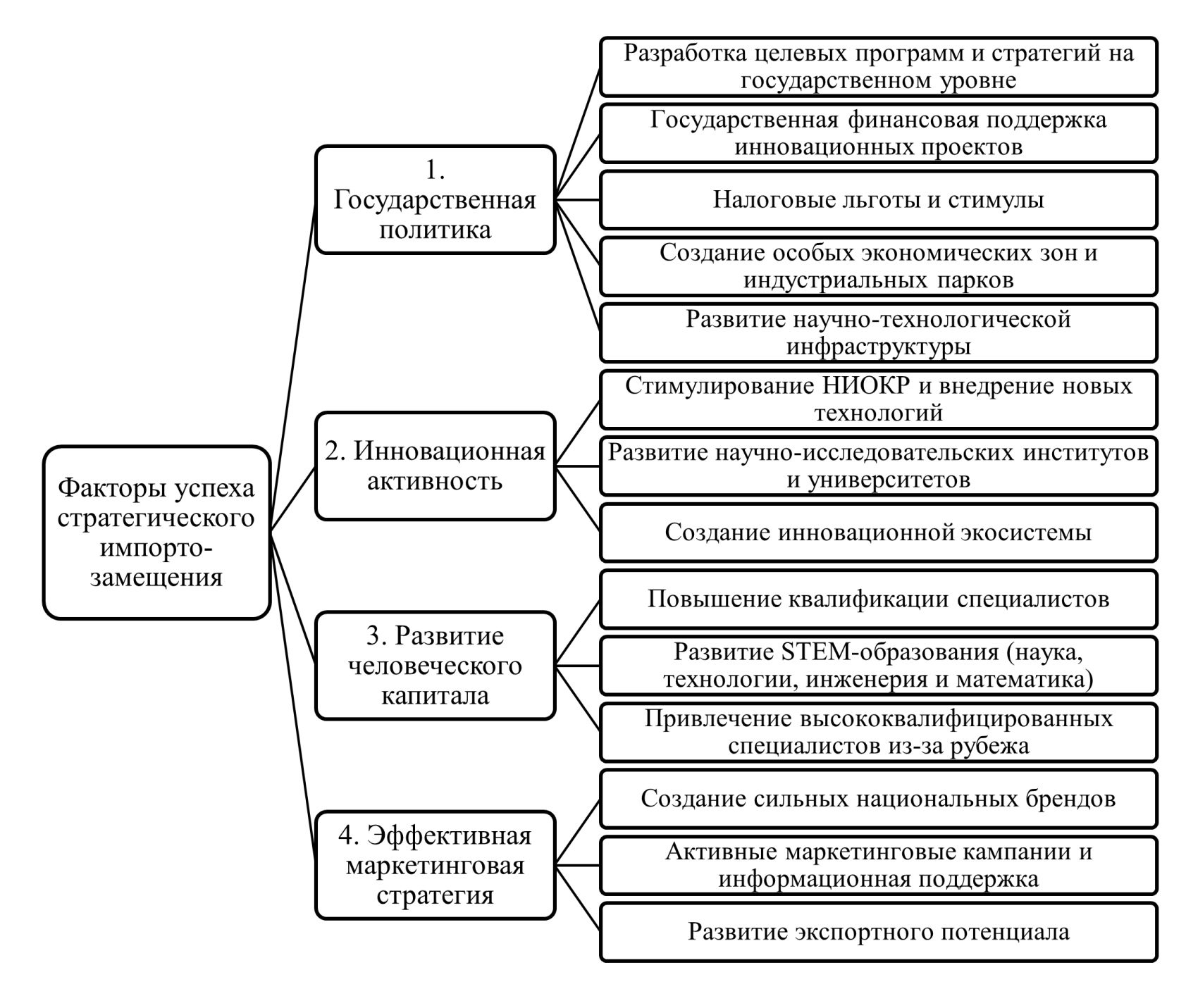 Стратегическое импортозамещение играет важную роль в развитии национальной экономики и обеспечении экономической безопасности страны. Успех этой стратегии зависит от ряда ключевых факторов, включая государственную политику, инновационную активность, развитие человеческого капитала и эффективную маркетинговую стратегию (рисунок 4).