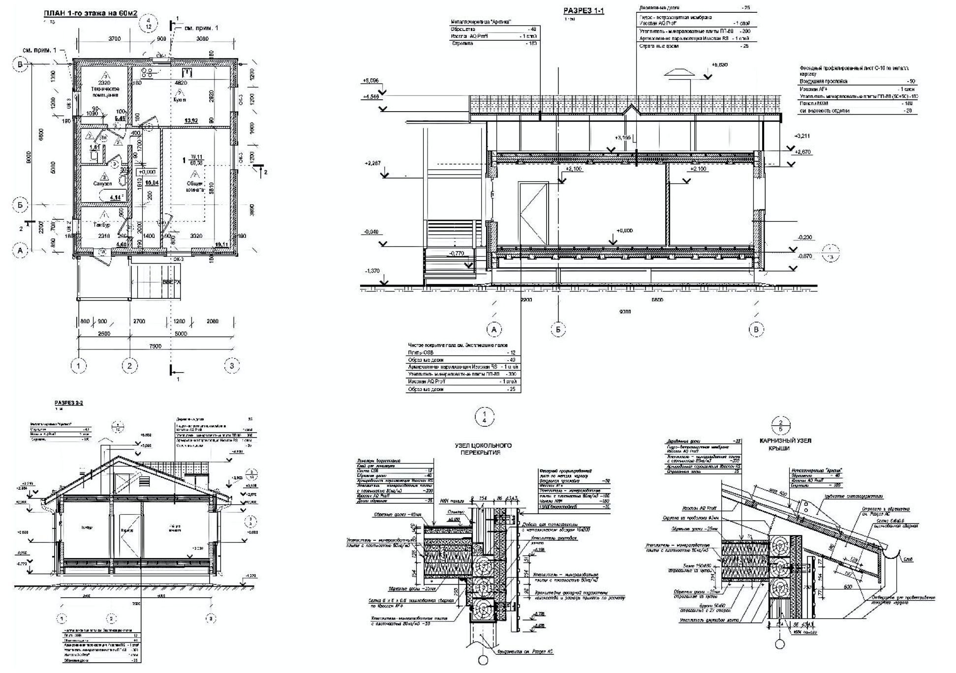 Рис. 1. План и разрезы дома из МХМ-панелей на 60 м2