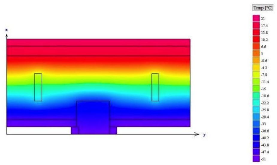 На участках сопряжения наружных и внутренних стен с цокольным перекрытием двухэтажного дома (рис. 2) распределение температуры также неравномерное. Средние значения температур на этих участках отрицательные и изменяются в диапазоне от -5,1 до -13,2 °С, что значительно ниже температуры точки росы. В узлах угловых соединений наружных стен также наблюдается неравномерность распределения температуры на поверхностях, где минимальная температура на стыках достигает значений до -11,0 °С.