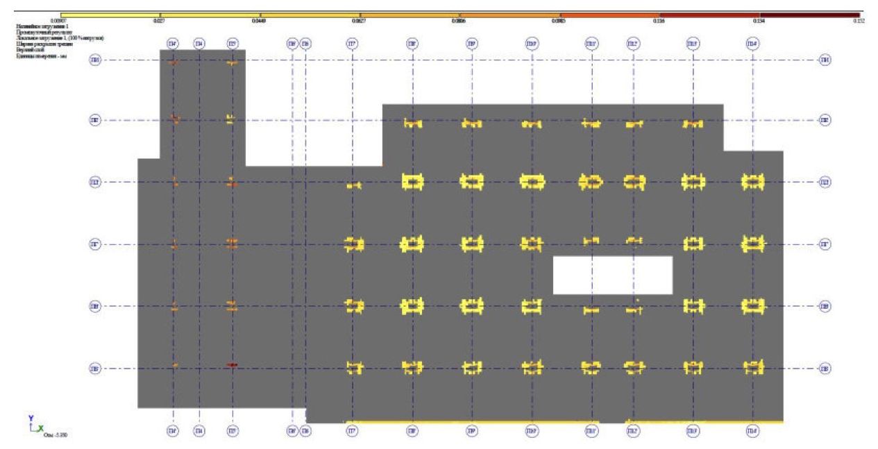 На рисунках 1-2 представлены результаты расчета плиты по трещинообразованию. Для выбранного участка выявлена контрольная нагрузка, равная 8 кН/м2.