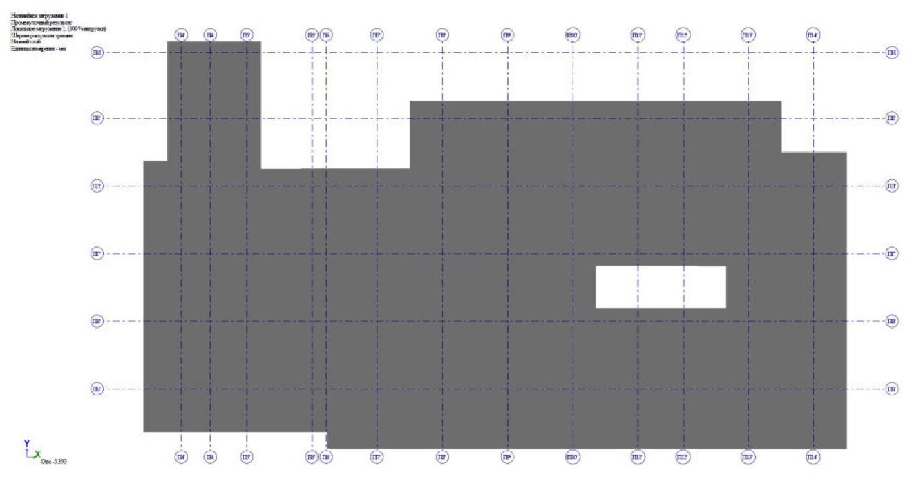 Исследование проведено в построечных условиях для монолитной железобетонной плиты перекрытия подземной автопарковки на реконструируемом объекте. Конструктивная схема – каркасно-стеновая, где вертикальными несущими конструкциями являются монолитные стены толщиной 250 мм и колонны сечением 500×500 и 500×800 мм. Плита перекрытия – плоская с капителями колонн, толщиной 300 мм.