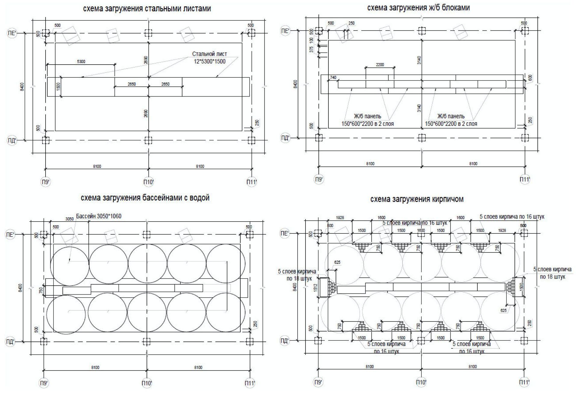 В качестве нагрузки использовались стальные листы 12×5300×1500 мм, железобетонные блоки 150×600×2200 мм, железобетонные упоры, кирпич, бассейны с водой.