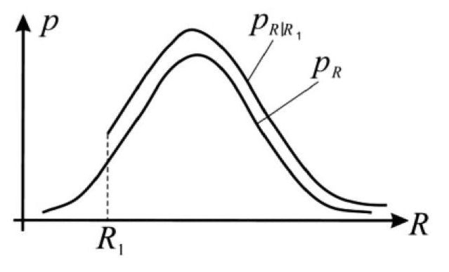 Итак, пусть известно, что в процессе предварительной эксплуатации конструкции был достигнут определенный уровень внутренних усилий в элементах системы, которому соответствовало сопротивление R1, отказы в данном случае не наблюдались. При этом можно принять во внимание, что происходит левостороннее усечение кривой распределения случайной величины сопротивления, и, таким образом, считать, что в рассматриваемой конструкции фактически отсутствует вероятность встретить величину расчетного сопротивления меньше чем R1. Другими словами, в расчет принимаются только такие параметры сопротивления, для которых выполняется условие R ≥ R1. Подходящая кривая плотности вероятности рR превращается в кривую рR|R1 (см. рисунок).