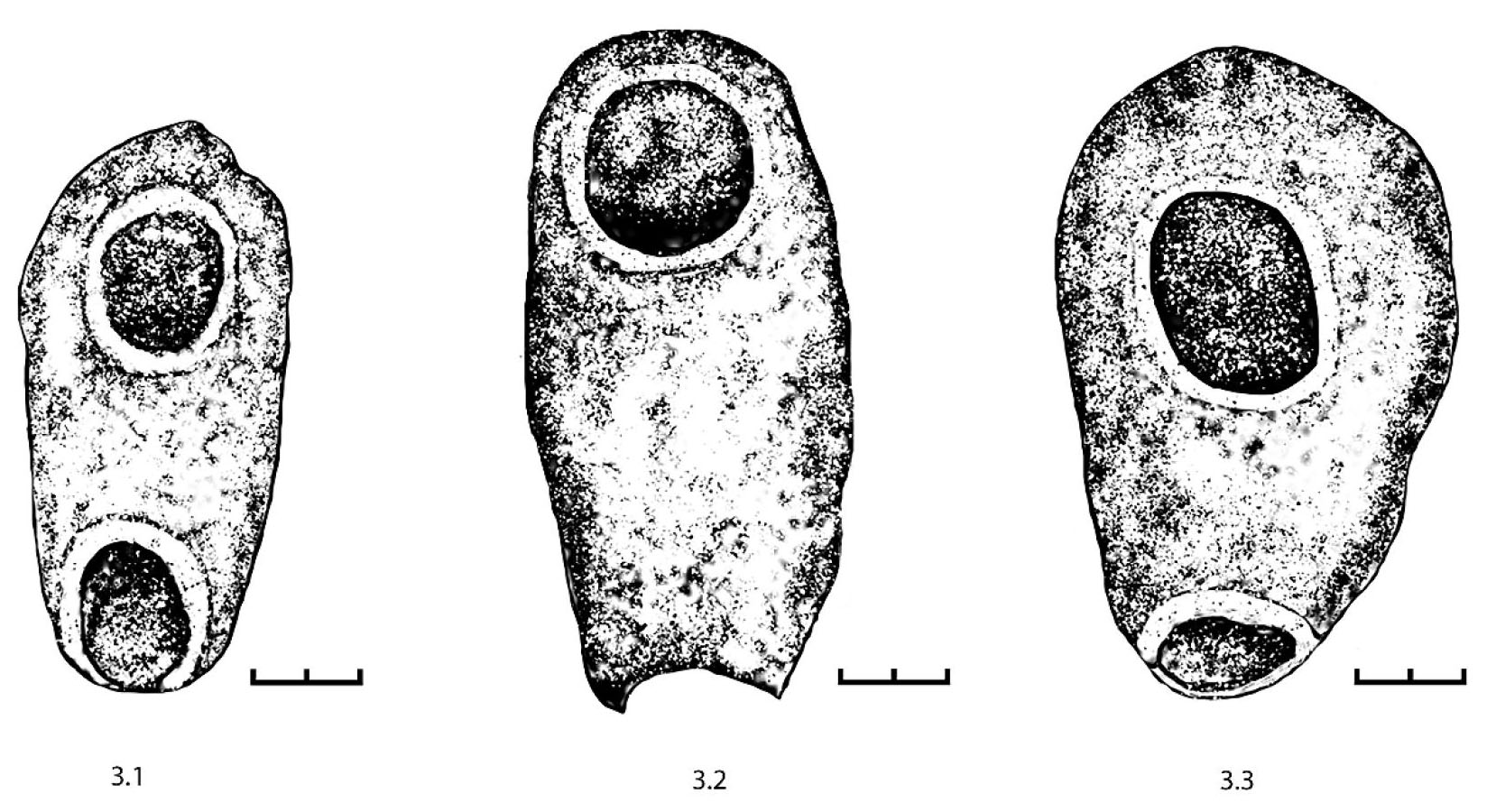 В одном из ниже залегающих слоев, датируемом амфорным материалом второй половиной I в. н.э., был обнаружен трехсекционный, вылепленный из глины предмет (Рис. 4.2). На поверхности сохранились следы нагара. В.П. Копылов предположительно обозначил его как светильник. Аналогий данному предмету нам не известно [Копылов 1999: 12–13, рис. 61].