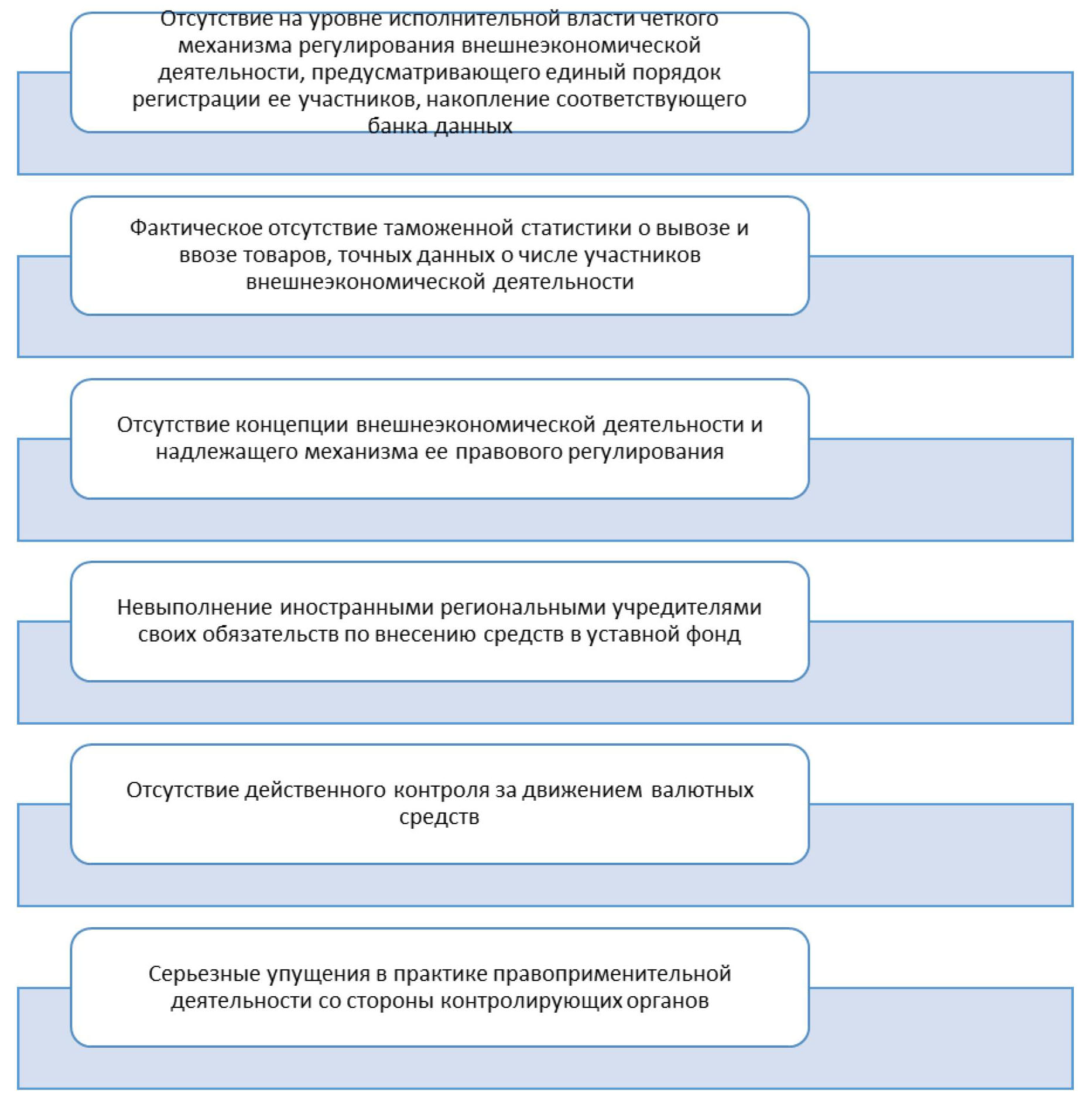 – иностранные партнеры выходили непосредственно на руководителей ведомств и предприятий и заключали контракты без предварительной экспертизы и учета интересов республики, проверки финансовой надежности, что приводило к стихийному развитию внешнеэкономической деятельности и не позволяло применять конкретные санкции к юридическим лицам, нарушающим законы КБР в этой области;
