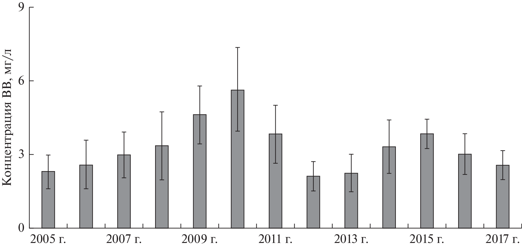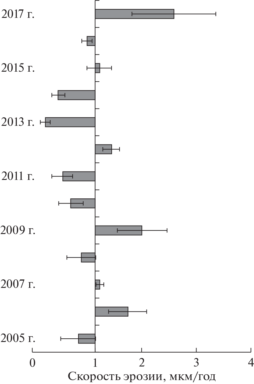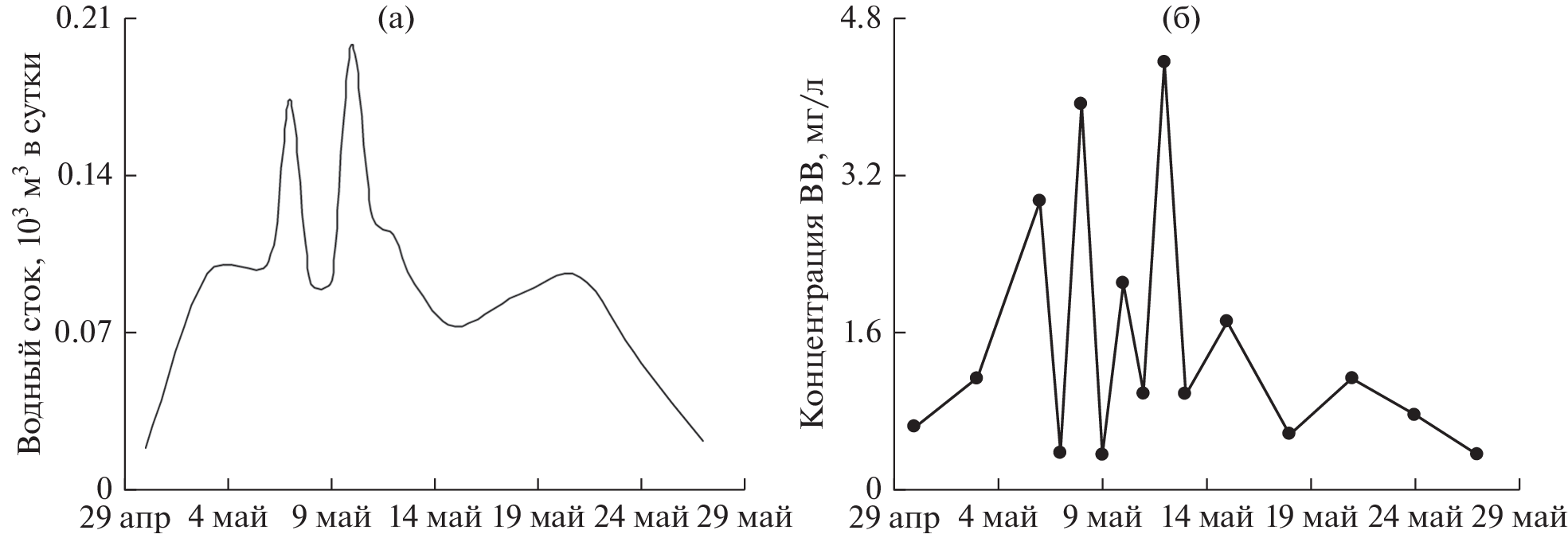 To determine the rate of decline in the drainage areas of the Karelian Coast, in the 2005–2017 period year-round observations of watercourses flowing into the Chupa, Medvezhya, Keret and Letnaya bays of the White Sea were carried out. In rivers and streams, seasonal and annual changes in water discharge and suspended matter concentrations were studied. It was revealed that the river water runoff does not exceed 2.5 km3, and the stream runoff does not exceed 45 mln m3 per year. The annual water runoff is distributed as follows: on average, 40 ± 2% is carried out during the spring flood, 33 ± 1% during the autumn flood, and 23 ± 1% during the summer low water. Despite the length of the winter period, the winter water runoff never exceeds 8% of the annual runoff. According to the suspended matter concentration, the watercourses of the Karelian Coast are classified as watercourses with a pure water mass, since the long-term average concentration of suspended matter in them is 3.30 ± 0.95 mg/L. It was revealed that the total river runoff of suspended matter is 6.5 thous. t per year; streams carry out less than 500 t of suspended matter per year. Based on the data obtained, an assessment was made of the module of suspended matter runoff and the rate of erosion of watersheds. The mean long-term modulus of suspended matter runoff averages 1.98 ± 0.31 t km–2 per year, the erosion rate is 1.1 ± 0.17 µm per year (n = 382). The low runoff modulus and the slow rate of decline in the catchment areas are due to the geographical location and geological and geomorphologic structure of the Karelian Coast.