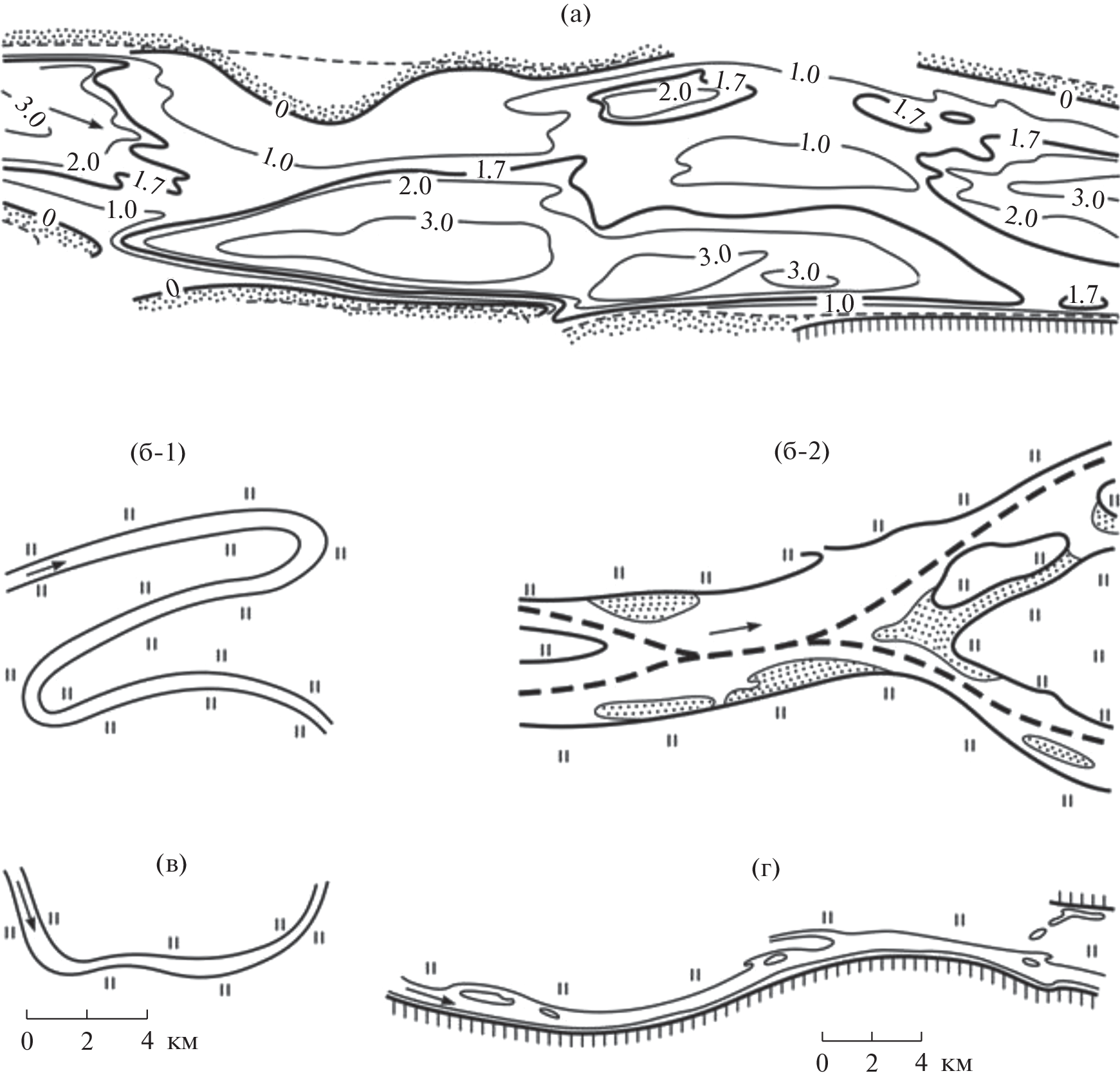 В статье на основе обобщения материалов по рекам Северной Евразии анализируется дискретность проявления русловых процессов и морфодинамических типов русла. Выделены пять структурных уровней относительно прямолинейных, меандрирующих и разветвленных рек. Процесс разветвления проявляется в существовании на реках точечных, осередковых, русловых (островных), пойменно-русловых разветвлений и раздвоенных русел (в дельтах больших и крупнейших рек – дельтовых разветвлений); процесс меандрирования – в извилистости динамической оси потока, не образующей русловых форм, побочневом русле, излучинах (пологих, развитых и крутых сегментных), сложных петлеобразных и больших излучинах. Из-за неустойчивости прямолинейного движения потока структурные уровни прямолинейных неразветвленных участков русла выделяются по их размерам: плесовые лощины на перекатах, вставки между смежными излучинами и звеньями сопряженных разветвлений, участки между одиночными разветвлениями и плесовые протяженные участки вдоль коренных берегов или во врезанном русле. Каждый структурный уровень генетически связан с предыдущим (осередки и побочни – основа формирования разветвлений и излучин и т.д.), представляют собой последовательности, хотя в ряде случаев это может иметь и иное происхождение (внутрипойменные перехваты, реликты дельтовых разветвлений и др.). На всех уровнях разветвлений и прямолинейного русла проявляются процессы меандрирования (излучины проток и рукавов, огибающих осередки и острова, извилистость рукавов пойменно-русловых разветвлений и раздвоенных русел) и формируются острова на крыльях и в привершинных частях излучин. Развитость той или иной формы проявления русловых процессов и уровней их проявления определяются размерами рек (малых, средних, больших и крупнейших), свободными или ограниченными условиями развития русловых деформаций, шириной поймы реки и ее соотношением с шириной русла, условиями прохождения руслоформирующих расходов воды и рядом местных факторов.