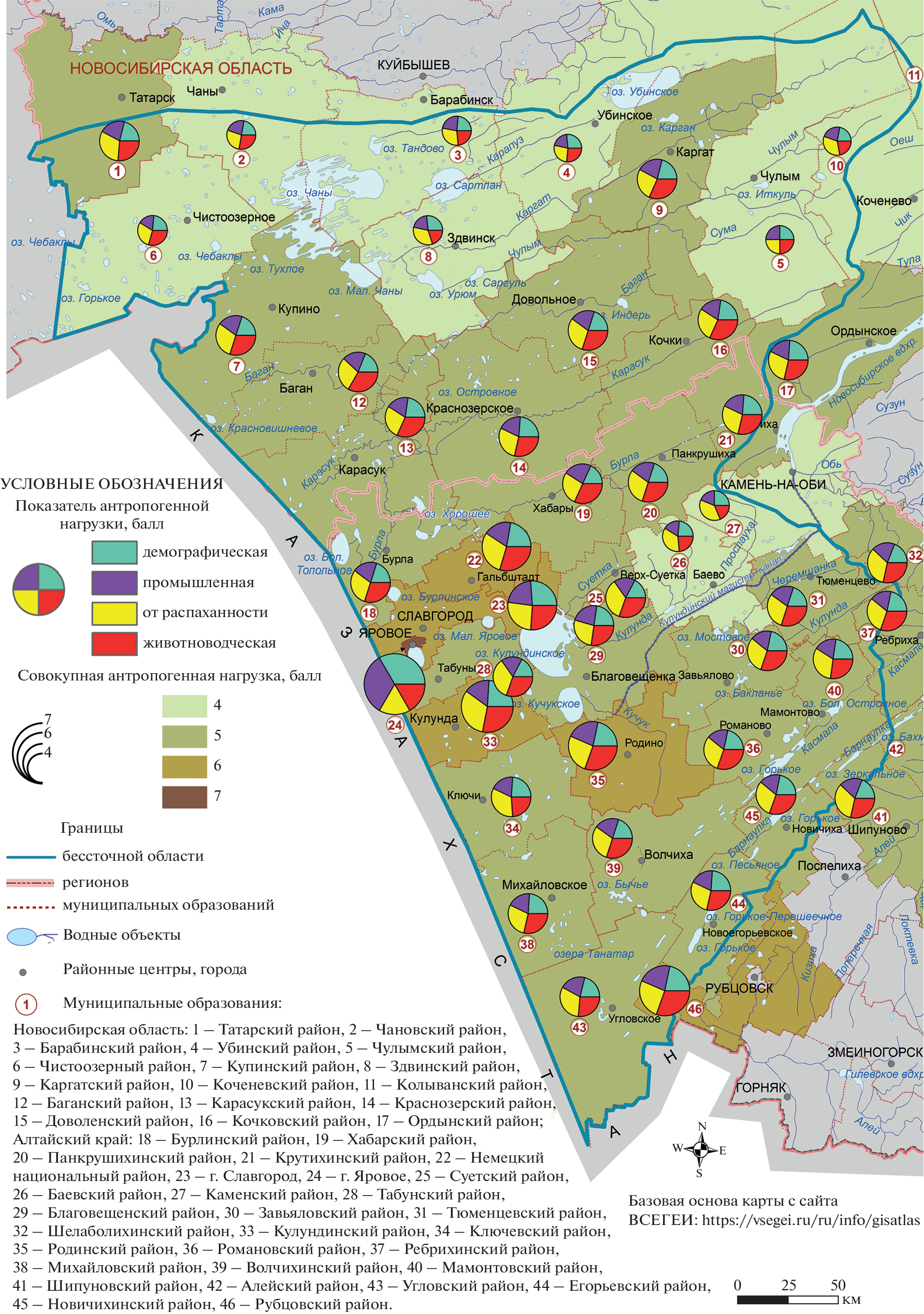 Anthropogenic load was assessed using two groups of indicators of direct (organized) and indirect (diffuse) impacts on the example of small rivers in the closed region of the Ob−Irtysh interfluve. Among the many assessment methods, those that have been tested in geographic and hydrological studies have been selected. Detailing and verification of the results of the assessment was carried out using remote sensing, field research, chemical-analytical and statistical methods. The assessment showed that the main sources of pollution of water bodies are the territories of rural settlements, livestock farms (complexes), areas for walking livestock and poultry, household waste dumps and municipal solid waste, that is, sources of diffuse pollution. There is a higher level of load within the drainless region of the Altai krai in comparison with the Novosibirsk oblast, which is associated with a more intensive development of the agricultural sector of the region’s economy. An inventory of sources of anthropogenic impacts by remote sensing methods revealed some difficulties, such as difficulties in determining existing facilities and their uses, a mismatch in the number of livestock complexes identified using the register of organizations and by visual interpretation of space images. The analysis of calculated data on phosphorus and nitrogen loads on individual water bodies is confirmed by estimates based on the results of field hydrological and hydrochemical studies.