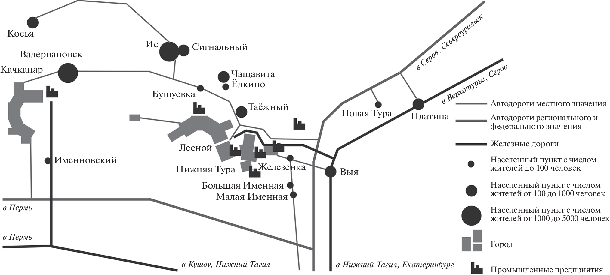 История Урала тесно связана с промышленным производством. Оно развивалось в ходе основных волн модернизации в стране и сопровождалось хозяйственным освоением территории, образованием новых поселков и городов. Значимым этапом является послевоенный период, когда в Уральском регионе реализовывались крупные проекты по добыче полезных ископаемых, строительству предприятий энергетики, атомной отрасли. В Свердловской области в конце 1940–1950-х годов на компактной территории между городами Нижним Тагилом и Серовом, в верхнем течении р. Туры, возникли три малых города. Нижняя Тура, основанная в середине XVIII в., выступила плацдармом для строительства Качканара и Свердловска-45 (современный г. Лесной) и благодаря этому стала многоотраслевым центром. Данную территорию, представленную тремя городскими округами, следует рассматривать как группу территориально сближенных поселений одного административного ранга, в развитии которой отражаются общероссийские проблемы: малых городов и городских округов; моно- и многоотраслевых городов; поляризации и сжатия освоенного пространства; внутренних и внешних вызовов. В статье исследуются формирование этой группы поселений, динамика численности населения, тенденции социально-экономического развития территории во второй половине 2010-х –начале 2020-х годов. Показано, что на развитие группы поселений оказали решающее влияние ресурсный и оборонный факторы, которые на современном этапе дополнились инновационным фактором. Качканар, центр горнодобывающей промышленности, является моногородом; Лесной, центр электрохимического машиностроения, имеет статус закрытого административно-территориального образования; в Нижней Туре функционируют предприятия энергетики, машиностроения, строительной отрасли. Градообразующие предприятия смогли адаптироваться к реалиям современной экономики. Число жителей территории сокращается, в среднесрочной перспективе эта тенденция может негативно отразиться на возрастном составе населения, качестве трудовых ресурсов.