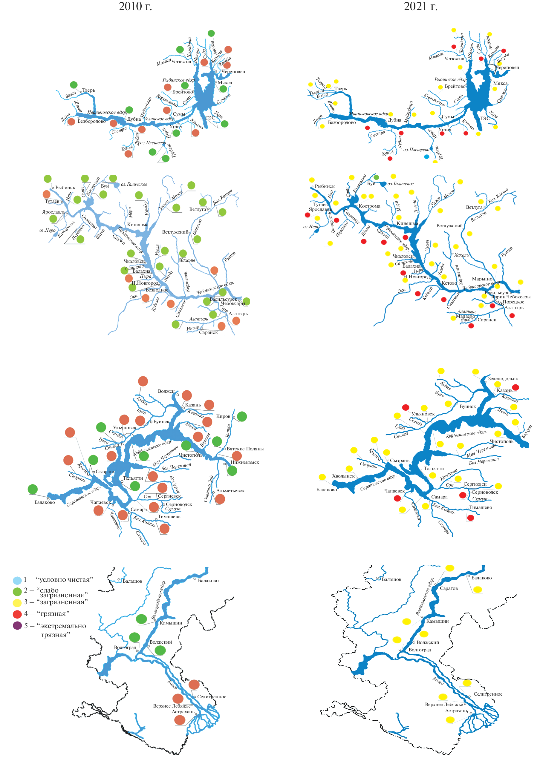 The Volga River has been the main Russian river for several centuries. The river, originating on the Valdai Hills, crosses several natural and climatic zones on its way to the Caspian Sea: from the southern taiga to the dry steppes of the Caspian Lowland. According to the latest data, 45% of industrial enterprises and 50% of agricultural production in Russia are concentrated in the river basin. The anthropogenic load on the river with its tributaries and their basins significantly exceeds the load on other large Russian rivers. The largest contaminated wastewater volumes fall on the share of Moscow, Samara, Nizhny Novgorod, Yaroslavl, Saratov, Ufa, Volgograd, Balakhna, Tolyatti, Ulyanovsk, Cherepovets, Naberezhnye Chelny and other large cities. All these negative processes occur against the background of ongoing climate change. The article analyzes the Roshydromet hydrochemical monitoring data of river waters in the Volga River basin for the 2000–2021 period by water bodies and federal subjects. Regardless of the year water content, almost 70% of hydrochemical monitoring stations in the Volga River basin correspond to the third quality class (“polluted”). An integral assessment of the water quality in the Volga River basin shows that the situation has not changed significantly since the end of the last century. To improve the ecological condition of the Volga River basin, it is necessary to implement a set of measures for the protection and reproduction of water resources in catchment areas, rationalize water use systems, and reduce the volume of freshwater intake. Reducing water consumption is a necessary condition for reducing the wastewater volume discharged and, consequently, the number of pollutants contained in it. One of the problems is that almost all types of water use harm the surface waters’ natural quality, including the Volga River basin.