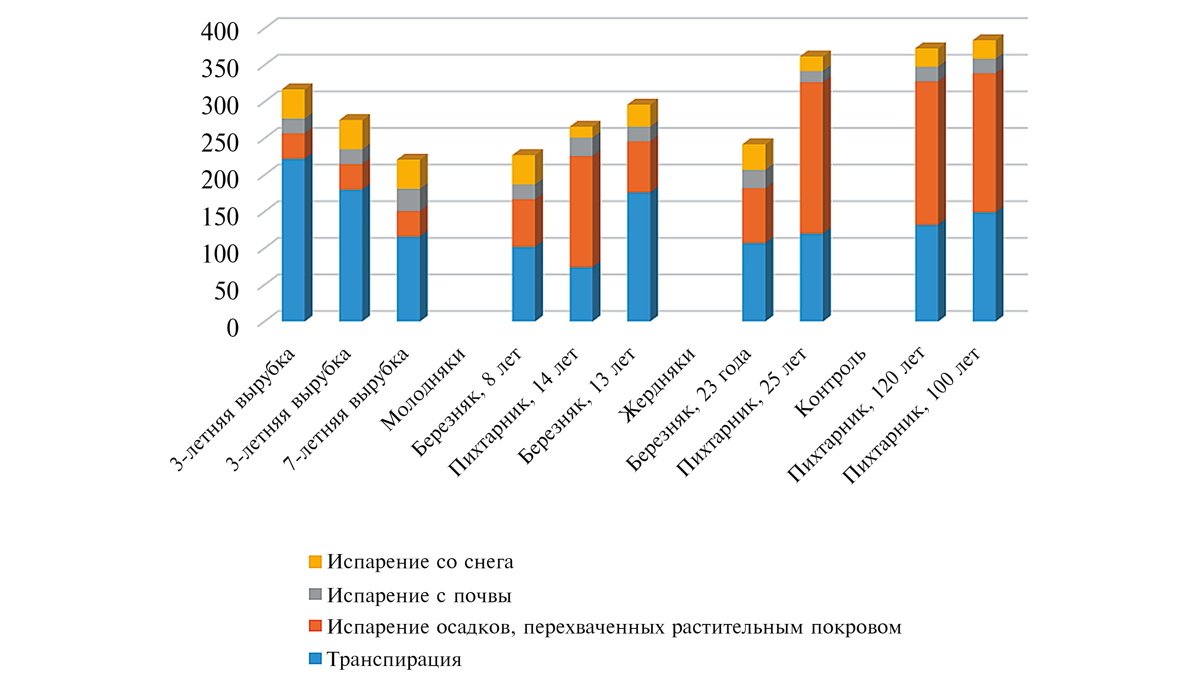 В целом на водосборе величина эвапотранспирации будет зависеть как от общей площади нарушений лесного покрова, так и от соотношения площадей, вырубленных в разные годы, т.е. стадий восстановительной сукцессии.