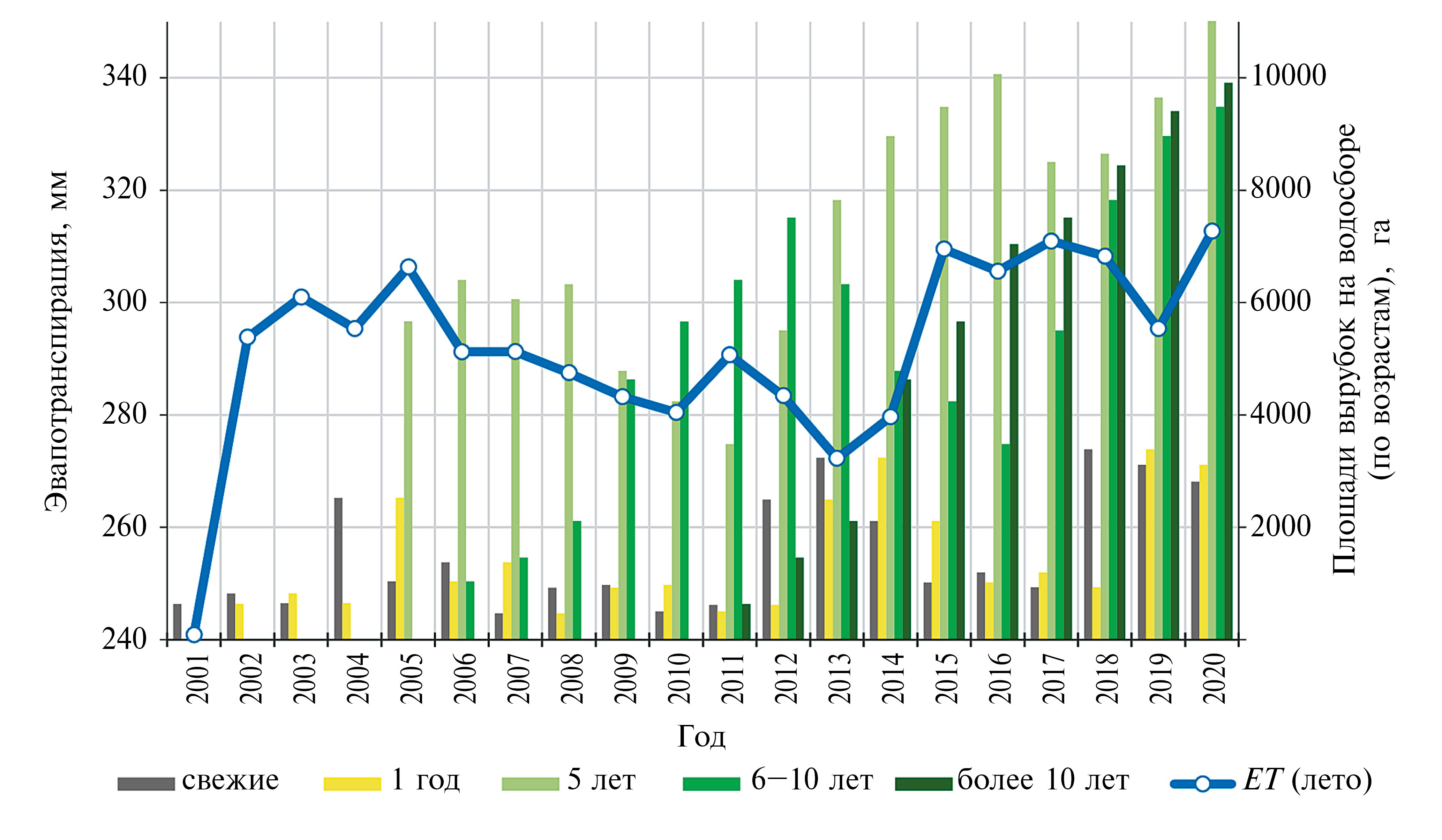 Рис. 4. Динамика площадей вырубок различной давности и летней эвапотранспирации (ET) для территории водосбора р. Сухой Пит.