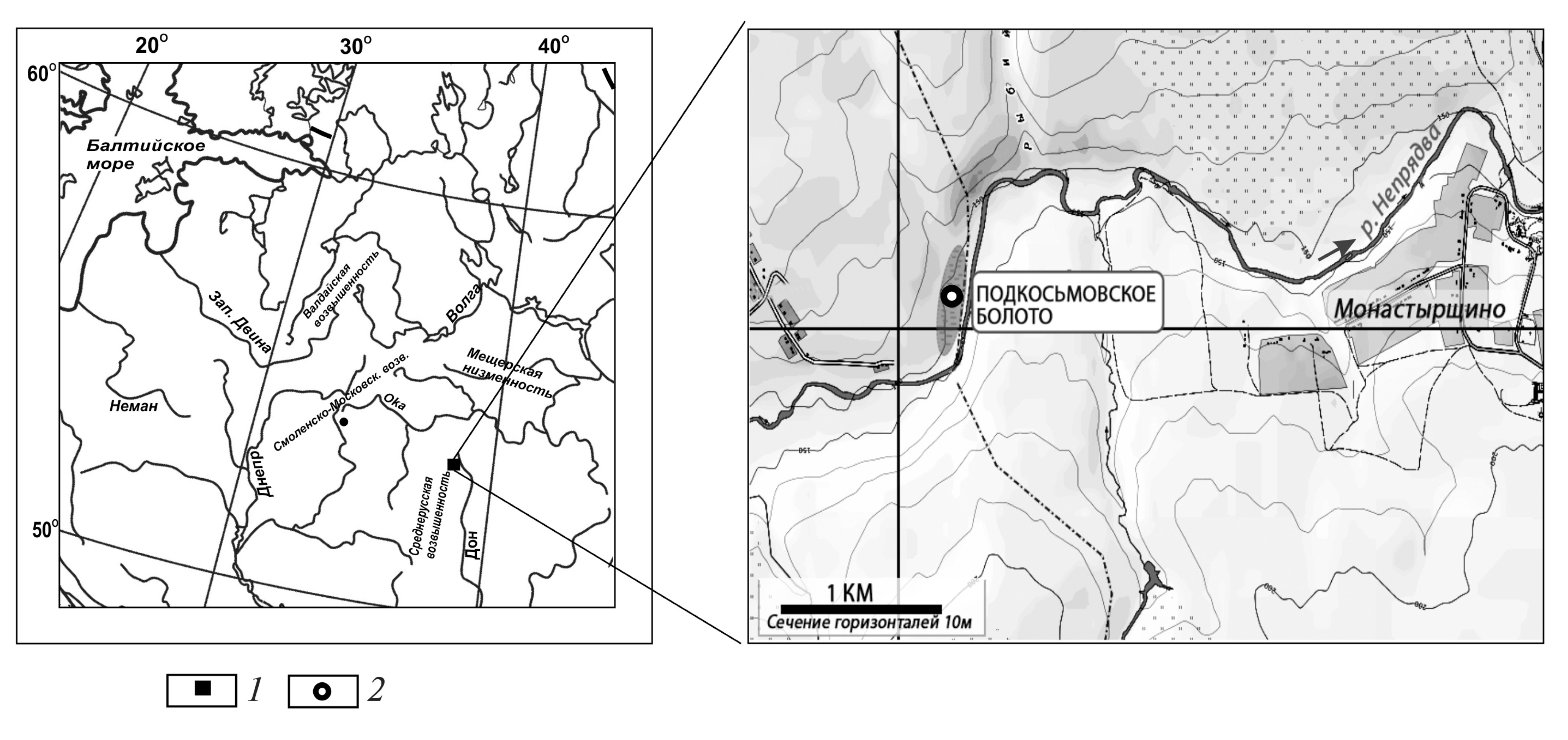 Реконструкция палеопожаров на территории музея-заповедника “Куликово поле” выполнена по данным изучения макроскопических частиц угля из торфяных отложений Подкосьмовского болота (53°40´117´´ с.ш., 38°35´258´´ в.д.), расположенного в пойме по левому борту долины р. Непрядвы, в 2 км выше по течению от с. Монастырщино (рис. 1) и занимающего вместе с заболоченными землями площадь около 3 га (Зацаринная и др., 2022). В питании болота принимают участие грунтовые и аллювиальные воды, что обеспечивает высокую минерализацию болотных вод (425–690 мг/л) и формирование эвтрофной растительности, которая представлена сообществами камышовой (асс. Scirpus sylvaticus), таволговой (асс. Filipendula ulmaria), заостренноосоковой (асс. Carex acutiformis) и хвощовой (асс. Equisetum fluviatile) ассоциаций. Указанные сообщества формируются при разном увлажнении: уровень залегания болотных вод варьирует от 3 до 40 см ниже поверхности болота в течение вегетационного сезона. Торфяная залежь болота имеет максимальную мощность 120 см. Отсутствие следов антропогенного воздействия на структуру торфяных отложений и современный растительный покров послужило основанием рассматривать Подкосьмовское болото как модельную болотную экосистему и придать ему статус особо охраняемой природной территории (ООПТ) (Постановление правительства Тульской области от 29.04.2015 № 210).
