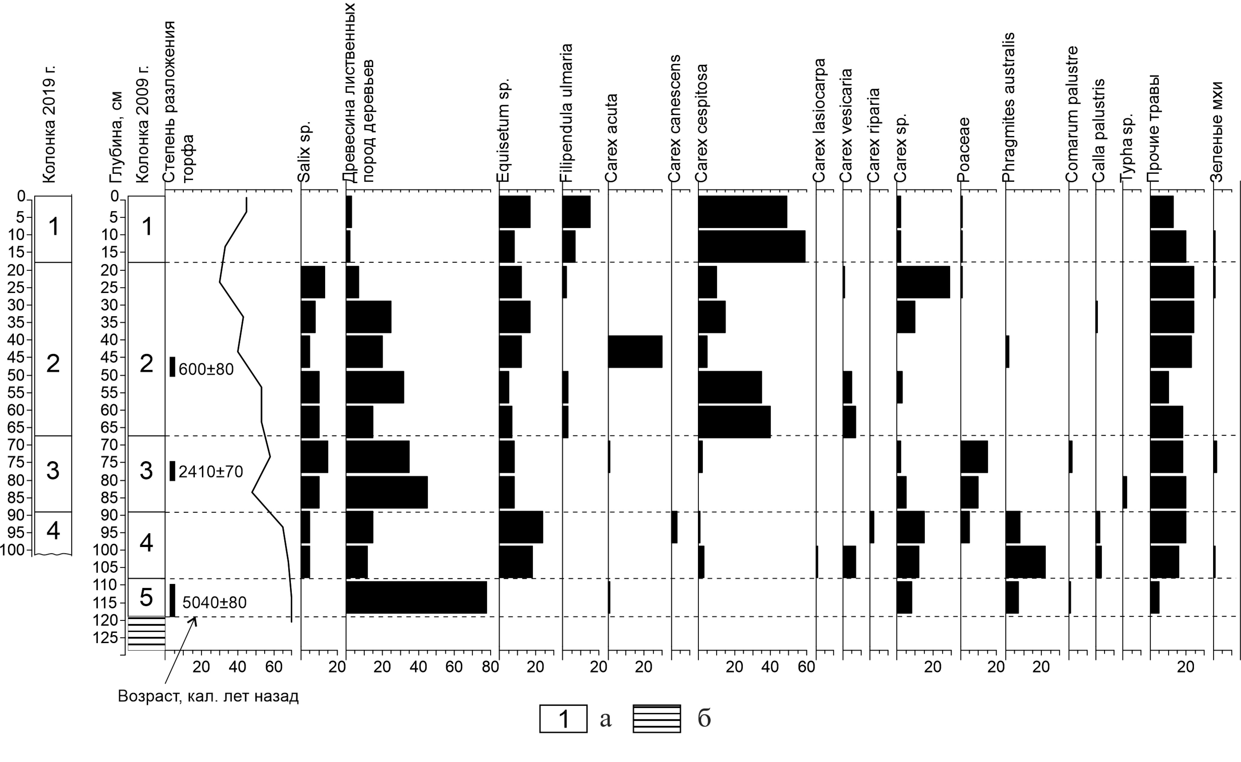 Рис. 2. Ботанический состав торфа Подкосьмовского болота и соотношение торфяных колонок, отобранных в 2009 и 2019 гг.: a – торф (виды торфа: 1 – осоковый, 2 – древесно-осоковый, 3 – древесно-травяной, 4 – травяной, 5 – древесный), б – глина.