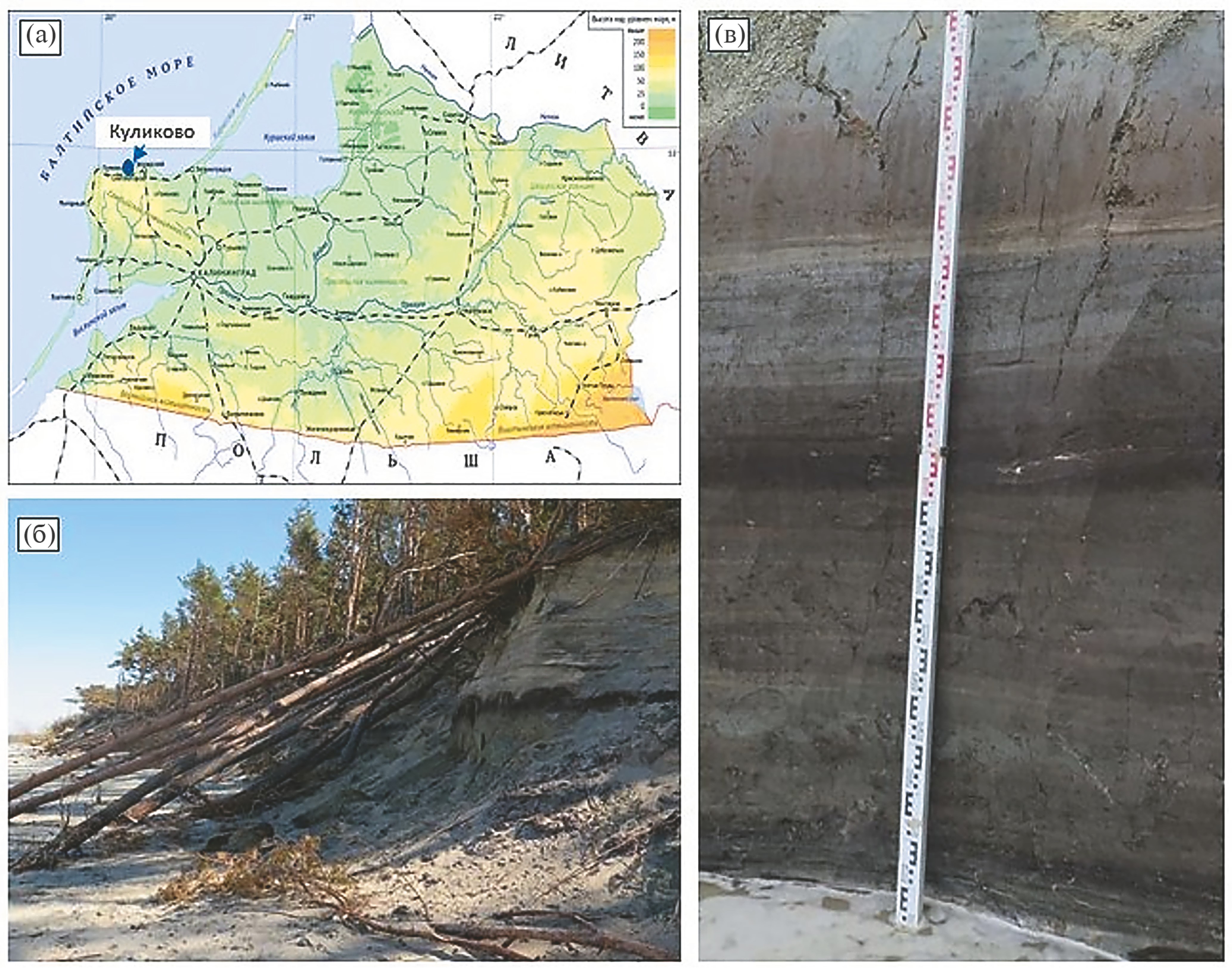 Рис. 1. Разрез Куликово: (а) расположение объекта исследований на карте Калининградской области; (б) абразионный склон Самбийского полуострова; (в) разрез Куликово.