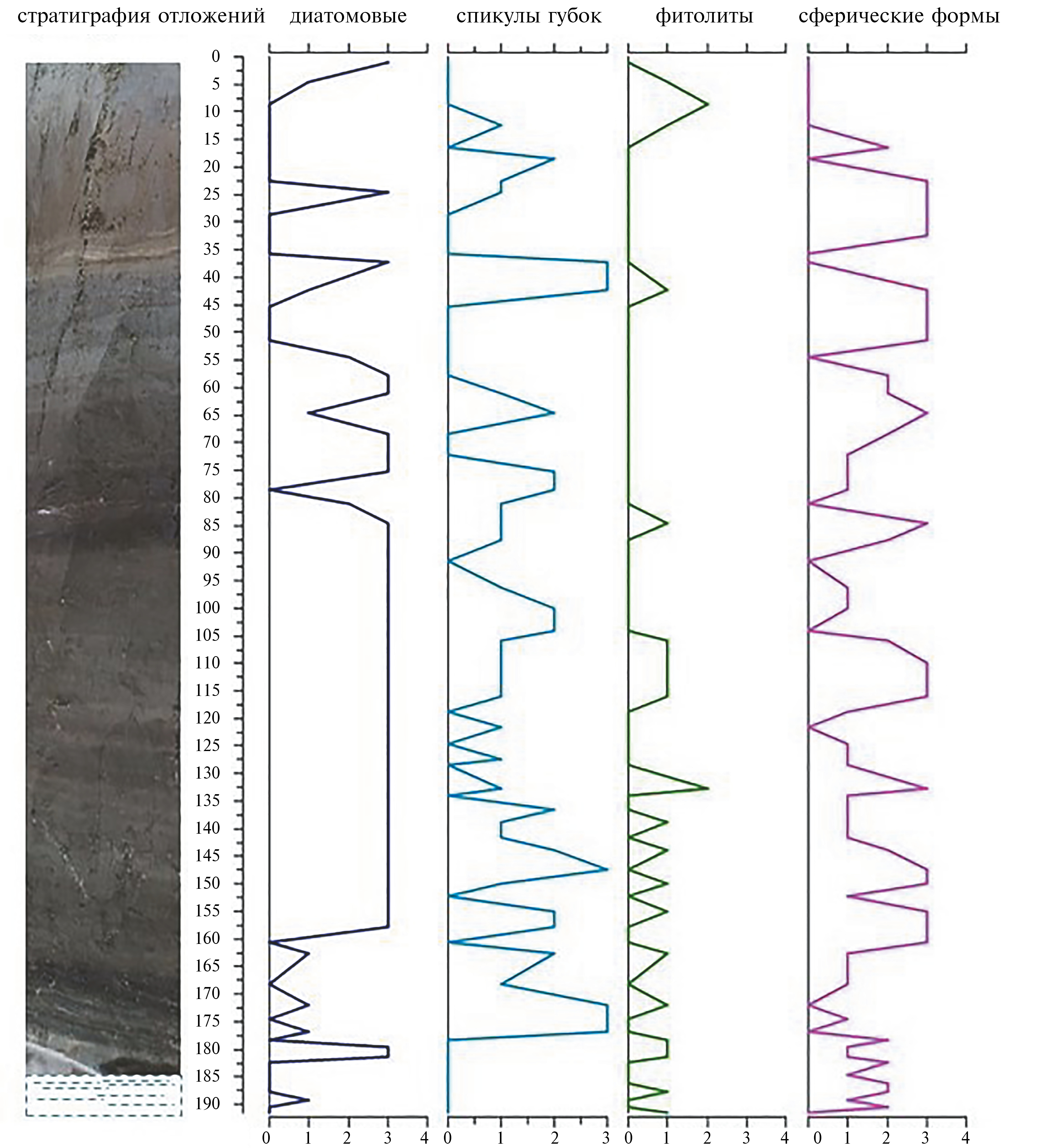 Состав микробиоморфного спектра. Изученные образцы обогащены органическим веществом и биогенным кремнеземом в разных его формах. В составе микробиоморфного спектра отложений выделены следующие основные группы микробиоморф: фитолиты, панцири диатомовых водорослей, спикулы губок. Результаты сравнительного полуколичественного анализа представлены на рис. 3. Во всех образцах отмечен также растительный детрит.