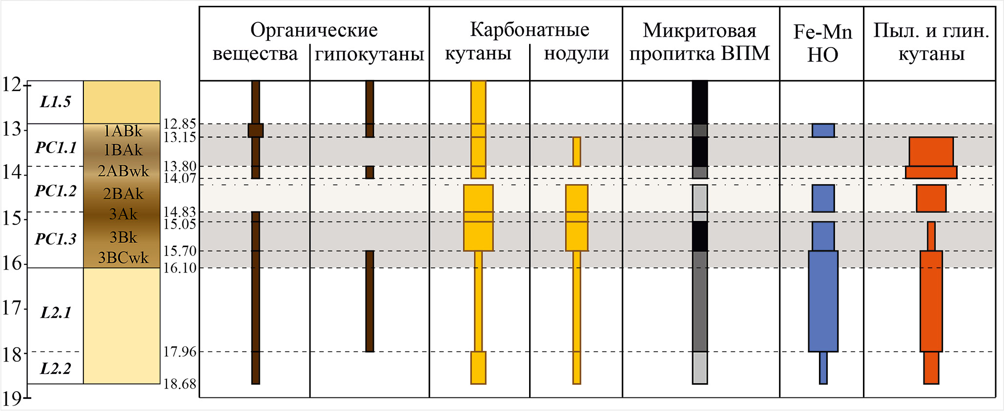 В процессе частичного выщелачивания карбонатов из горизонта 2ABwk срединной палеопочвы в верхнюю часть горизонта 2BAk отмечается образование тонких горизонтальных карбонатных прослоек. Мы предполагаем, что они являются начальной стадией образования карбонатной коры и образованы за счет локального обводнения. В целом для срединной палеопочвы (PC1.2) отмечено максимальное окарбоначивание, выражающееся в большом количестве карбонатных прожилок и кутан, что также говорит об активном внутригоризонтном перераспределении породных карбонатов, связанных с более гумидной фазой почвообразования.