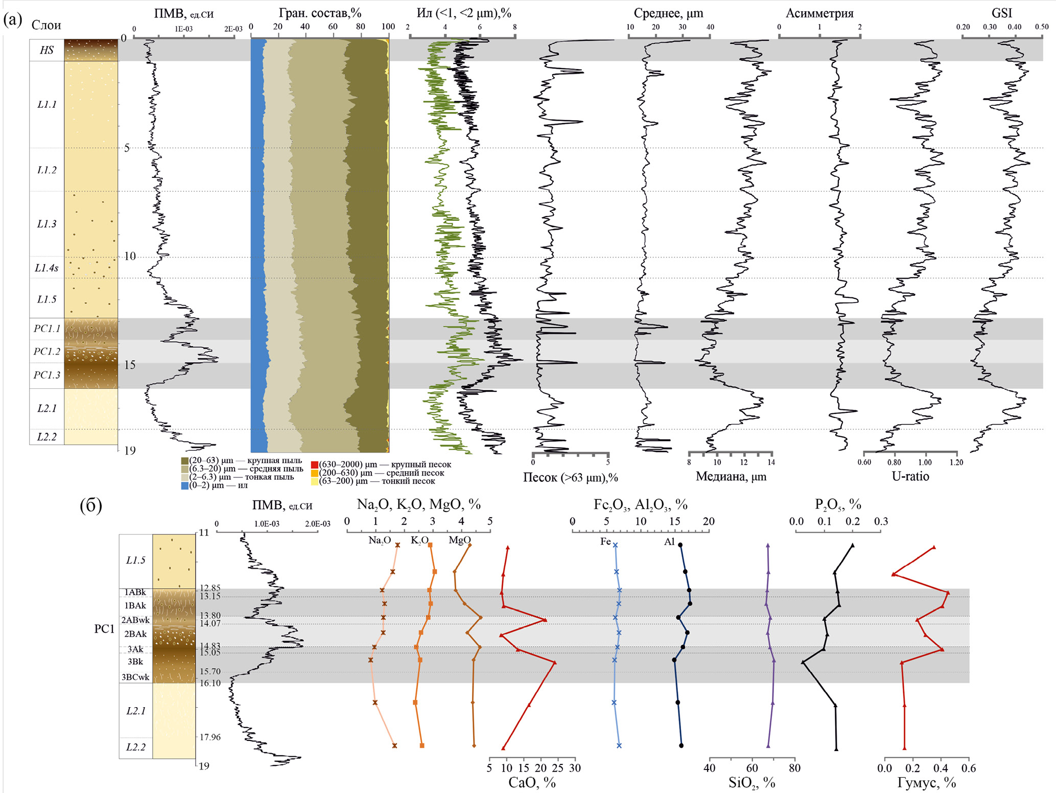 Рис. 5. Профильное распределение результатов магнитометрического и гранулометрического анализов. HS – голоценовая почва. ПМВ – полевая магнитная восприимчивость (ед. СИ). Ил – частицы <1 μm отмечены зеленой линией, <2 μm – черной линией (а). Профильное распределение результатов химического анализа (б).