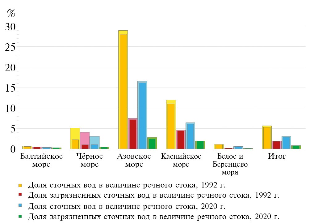 При этом общий средний многолетний речной сток в результате безвозвратных изъятий снизился в 1992 г. примерно на 4%, на водосборе Каспийского моря несколько более чем на 8%, на водосборе Азовского моря на 30–32%. Антропогенное снижение общего стока на ЕТС в 2020 г. составило около 3%, на водосборе Каспийского моря – около 6%, а в бассейне Азовского моря – 20–21%. В процентном отношении к величине относительного уменьшения стока в бассейне Каспийского моря приближается водосбор Чёрного моря с учетом территории в верховьях Днепра. На водосборах других морей уменьшение речного стока как в 1992 г., так и в 2020 г. составило величины, близкие к 1% или меньше. Если судить по кратности разбавления сточных вод, в том числе загрязненных, то в сторону наименьших значений также выделяются Азовский и Каспийский бассейны. При средней кратности разбавления сточных вод ресурсами стока за вычетом безвозвратного расхода для всей территории Европейской России в 1992 г. несколько более 19 раз, в Каспийском бассейне соответствующая величина составила 8 раз, а в Азовском – всего 2 раза, при разбавлении загрязненных сточных вод соответственно несколько более 50, 20 и около 10 раз. В 2020 г. эти показатели составили соответственно 122, 48 и 28 раз. В других бассейнах кратность разбавления сточных вод гораздо выше, чем на водосборах Азовского и Каспийского морей. Однако выявленные большие кратности разбавления не дают основания считать воды на этих водосборах чистыми, не говоря уже об отдельных местах повышенной антропогенной нагрузки.