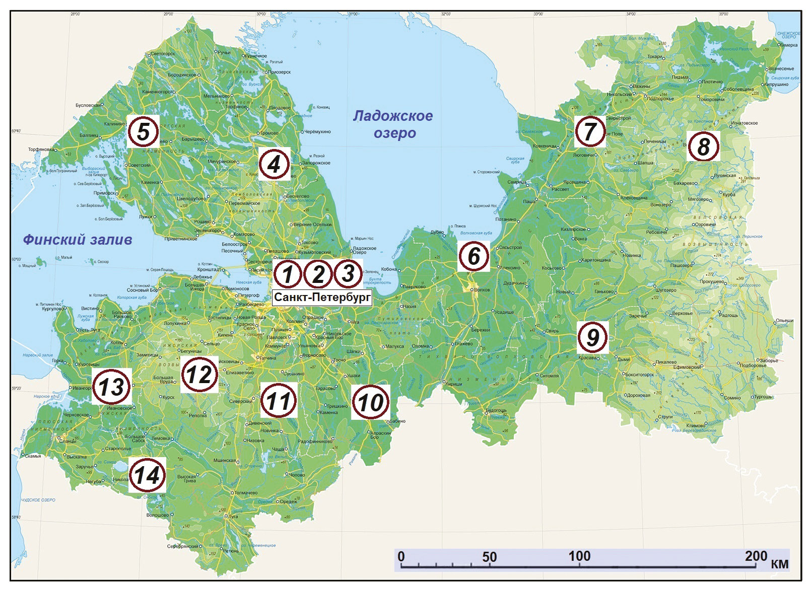 1 – г. Санкт-Петербург; 2 – пос. Воейково; 3 – г. Шлиссельбург; 4 – пос. Сосново; 5 – г. Выборг; 6 – г. Новая Ладога; 7 – г. Лодейное Поле; 8 – с. Винницы; 9 – г. Тихвин; 10 – г. Любань; 11 – дер. Белогорка; 12 – г. Волосово; 13 – г. Тихвин; 14 – дер. Николаевское