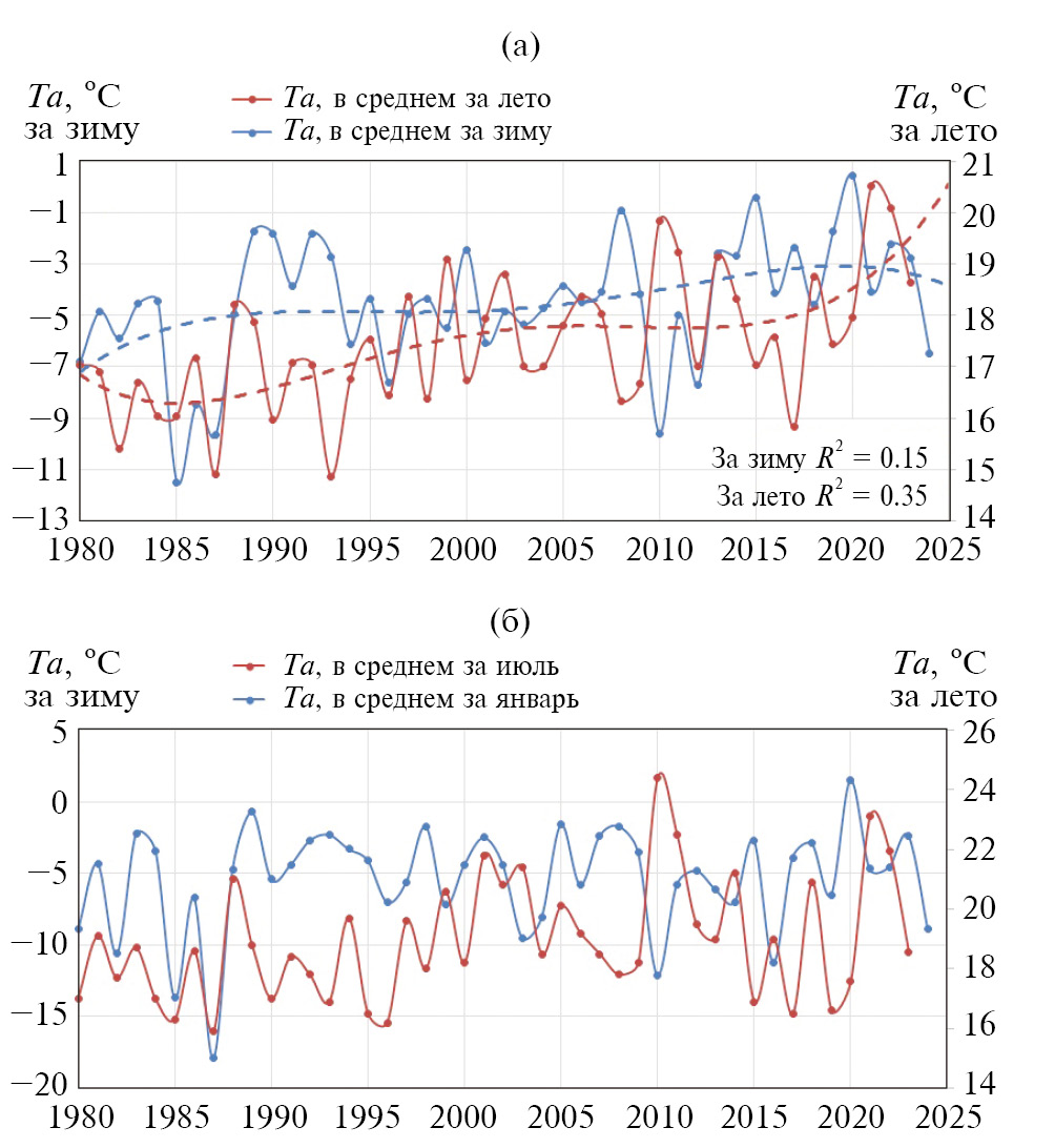 Рис. 2. Многолетняя изменчивость температур воздуха в Санкт-Петербурге: (а) изменения температуры воздуха в среднем за лето и зиму; (б) изменения температуры воздуха в среднем за январь и июль. Пунктирными линиями на рис. 2а показаны полиномиальные тренды по пятилетиям. Ta – температура воздуха, °С