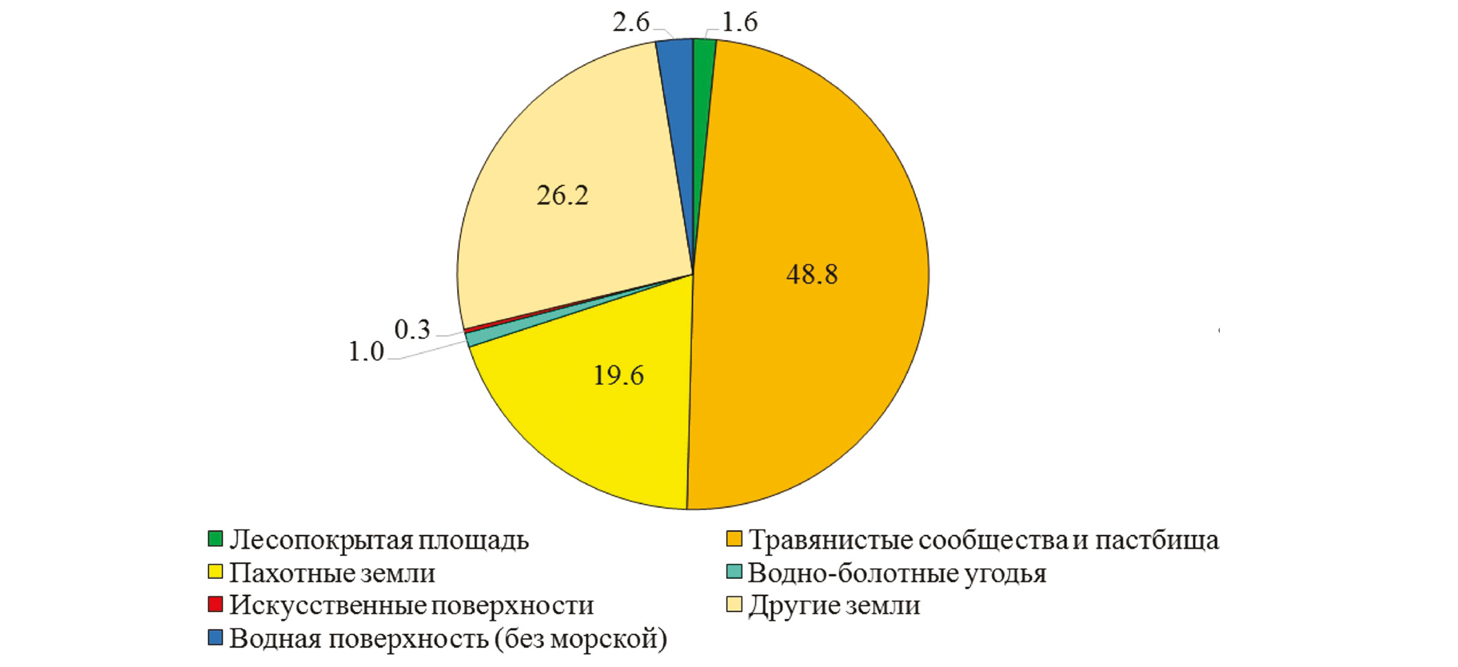 Наземный покров исследуемой территории (рис. 1) почти наполовину представлен лугами и пастбищами, около 20% занимают пахотные земли, расположенные в основном в российской и казахстанской частях. Пустынные области (в основном классифицируемые как “другие земли”) занимают более четверти площади региона (рис. 2). Лесные земли занимают в основном предгорья Кавказа на западе и склоны Эльбурса – на юге региона.