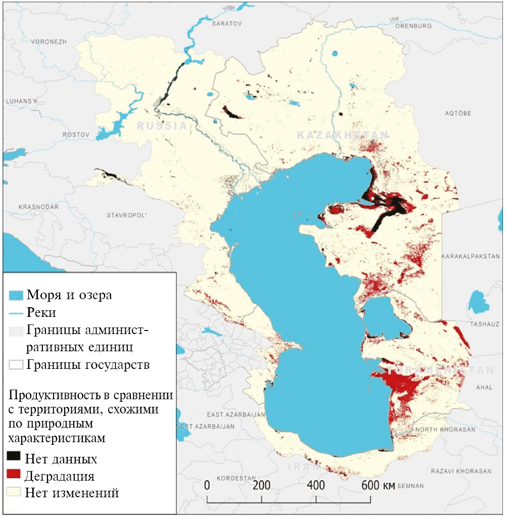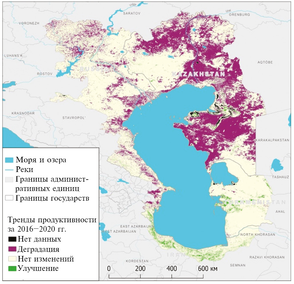 Расчеты “тенденции” продуктивности земель, полученные методами линейной регрессии для каждого пиксела, показывают (рис. 4), что в северной и центральной частях Прикаспия на равнинных пастбищных и пахотных угодьях доминируют отрицательные (указывающие на деградацию земель) тенденции продуктивности, за исключением затопляемых маршевых ландшафтов в районе залива Мертвый Култук. В южной части преобладают положительные тренды, преимущественно связанные с возрастанием лесистости горных склонов и улучшением земледельческих практик и управления землепользованием в иранской и азербайджанской части региона. В туркменской части наблюдаемые положительные тренды NDVI связаны с одной стороны – с закреплением песков и солончаков в районе залива Туркменбаши, а с другой – с отступанием береговой линии мелководного залива, зарастанием новой суши влаголюбивыми галофитами.