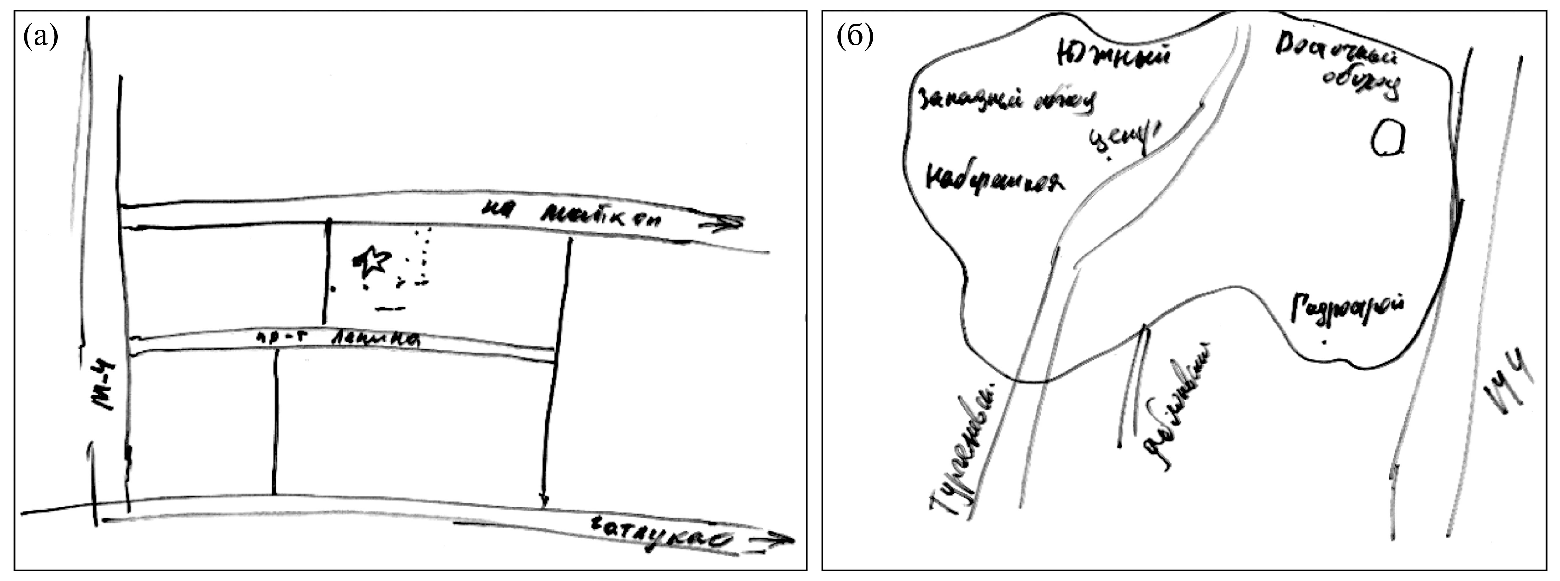Еще ярче подсознательная инкапсуляция жизненного пространства проявилась в рисунках жителей поселков Новая Адыгея и Яблоновский, недавно переехавших в Краснодарский край из других регионов РФ (рис. 6). На вопрос модератора о значении круга на изображении Новой Адыгеи (см. рис. 6а) был получен весьма характерный ответ: “Ну, я представляю, что наш поселок какой-то круглый, что ли… ну, что он большой, но дорога из него узкая”. Ощущение пространственной обособленности было свойственно и новоселам со стажем: “... Так получилось, что я на Космической живу… в Яблоновском, там такой очень изолированный и самодостаточный... компактный район” (см. рис. 6б).