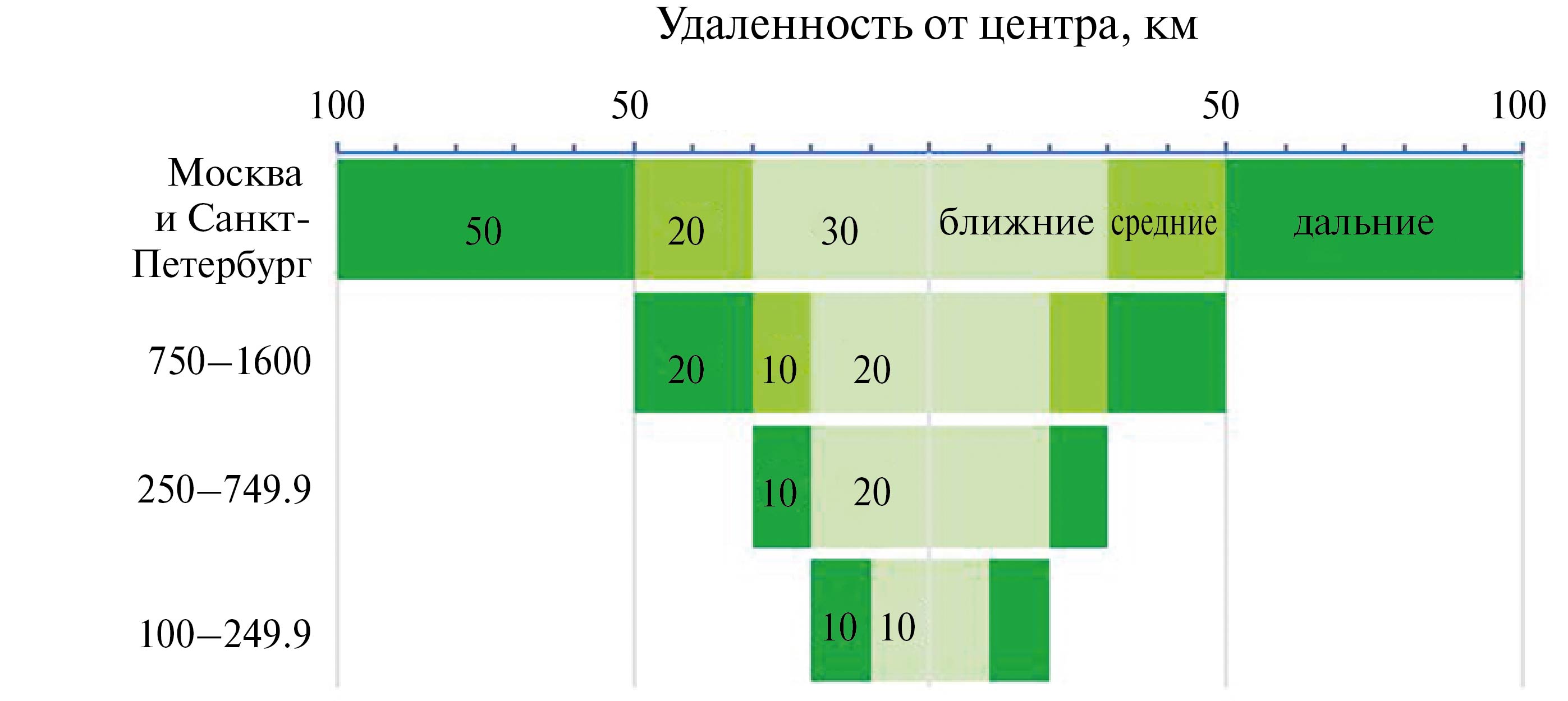 Привлекательность ближних пригородов универсальна для населения городов разных размеров, она свойственна и городам-миллионникам, и городам людностью немногим выше 100 тыс. чел. В данной работе мы изначально предположили (и исходя из этого произвели расчеты), что границы разных видов пригородов зависят от размеров центра. С одной стороны, мы действовали объективно, сообразуясь с наблюдаемыми нами и иными исследователями закономерностями. С другой стороны, издержки поездок из дальних пригородов городов людностью 100–250 тыс. чел. не соответствуют издержкам, затрачиваемым на поездку из дальних пригородов Москвы или Санкт-Петербурга в центры городов в силу значительно большей удаленности последних. Это может делать сравнения дальних и ближних пригородов менее корректными. Аналогично можно предполагать, что границы пригородов Москвы и Санкт-Петербурга в силу их разной людности, также не могут выделяться как равные. Однако общее правило – существенно бо́льшая привлекательность ближних пригородов в сравнении с иными – действует и с учетом этих ограничений.
