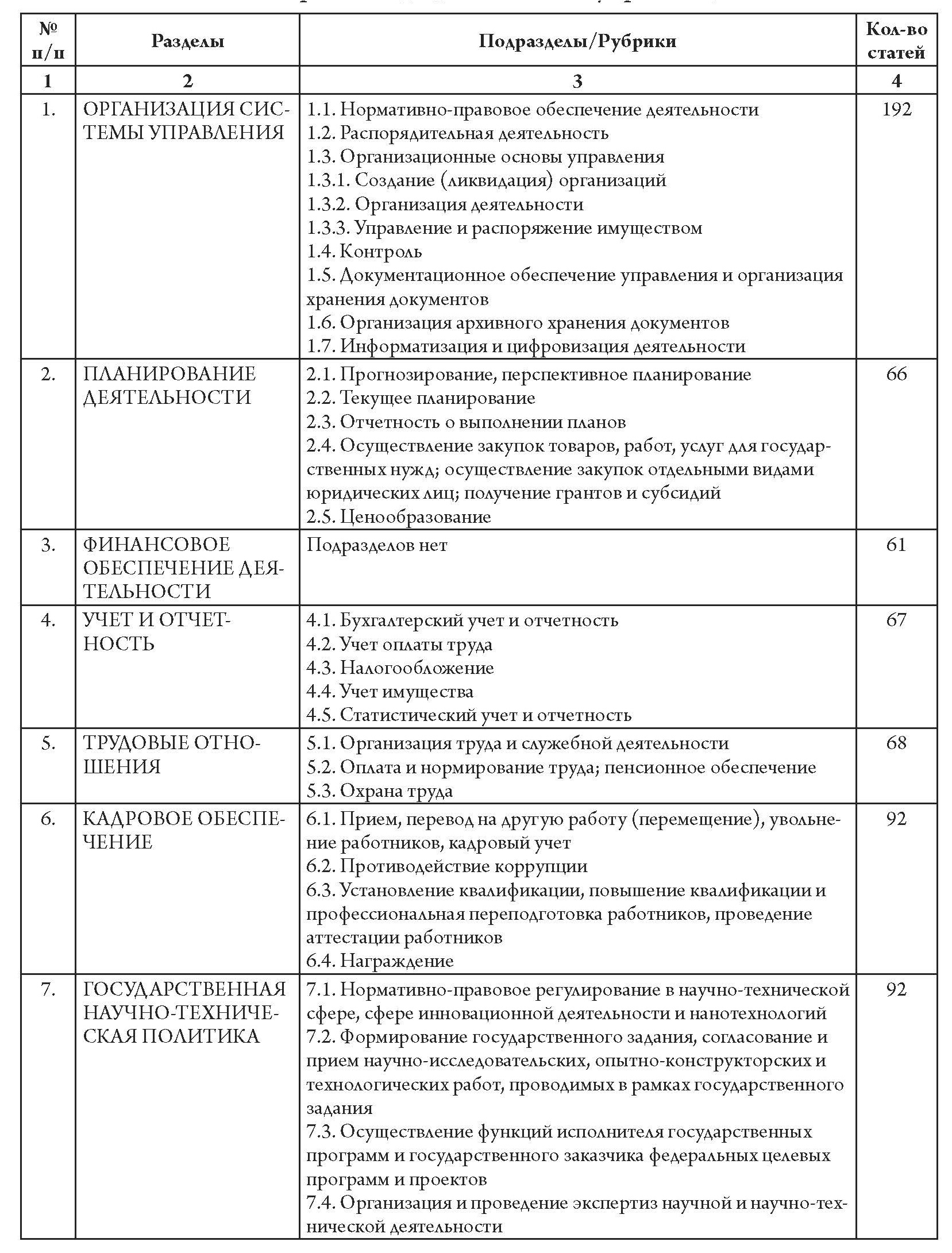 Перечень содержит 19 разделов, отражающих как общие вопросы, так и специфику деятельности (табл. 2). Большинство разделов разделено на подразделы, их общее количество – 74. Дополнительно один из подразделов (1.3) содержит три рубрики. Всего утвержденный Перечень Минобрнауки России содержит 2 009 документов.