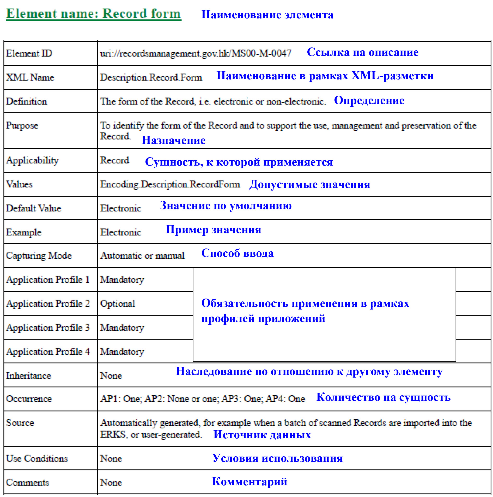 Рисунок 1. Пример описания элемента метаданных (свойства) из Стандарта делопроизводственных метаданных австралийского правительства (Австралия)