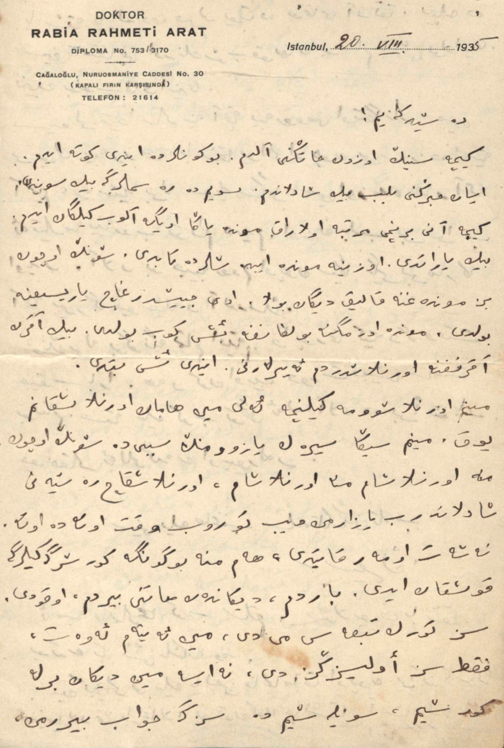 В статье анализируется письмо Рабиги Арат, адресованное супругу, известному ученому, тюркологу Рашиту Рахмати Арату. В представленном документе Рабига ханум пишет о семейных новостях, жизни татарского эмигрантского сообщества. Данный документ личного происхождения позволяет воссоздать картину жизни татарских эмигрантов за рубежом. Письмо Рабиги Арат содержит информацию о повседневной жизни, взаимоотношениях в семье и с друзьями. В нем приводятся сведения, показывающие место татарской женщины в социальной жизни Турции. Лейтмотивом текста служат переживания Рабиги ханум о своей профессиональной деятельности в эмиграции. Она получила высшее образование в европейской стране, но ее знания и профессиональный опыт в Турции не были востребованы. Рабига ханум, воспитанная в татаро-мусульманской среде, выбирает семейные ценности.