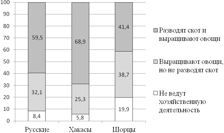 Полученные в исследовании результаты подтверждают, что коренные народы сохраняют ориентацию на исторически сложившиеся для своей этнической общности виды хозяйственной деятельности. Хакасы, например, склонны заниматься разведением скота, причем по сравнению с русскими и шорцами они более активны в скотоводческой деятельности (рис. 1). Хозяйство хакасов более многочисленное и разнообразное: они держат коров (46,8 %), свиней (48,9 %), птицу (43,2 %), овец (15,8 %) и других животных (12,6 %). Русские в среднем имеют в хозяйстве не более двух видов скота, причем один из них это птица (45,3 %). Шорцы не склонны держать много скота: 46,1 % из них держат на подворье всего один вид скота – чаще это корова (31,2 %), реже свиньи (19,9 %) или птица (18,3 %).