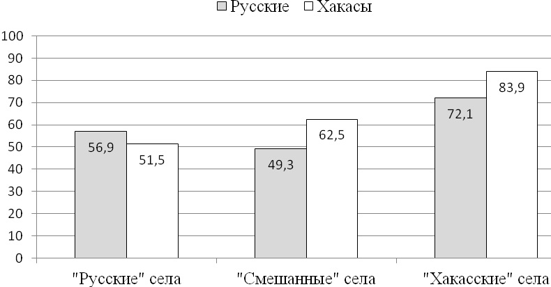 Проживающие на территории региона русские ведут хозяйственную деятельность, но по сравнению с хакасами меньше разводят скот (рис. 1). Анализ хозяйственных практик в разрезе сел по этническому составу показал, что в селах с преобладанием хакасов русские так же активно занимаются разведением скота (рис. 2). В смешанных поселениях и в селах с преобладанием русских разница менее заметная, причем в последних хакасы даже уступают русским по уровню разведения скота. Можно сделать вывод о том, что социокультурная и этническая среда влияет на установки по ведению хозяйственной деятельности.