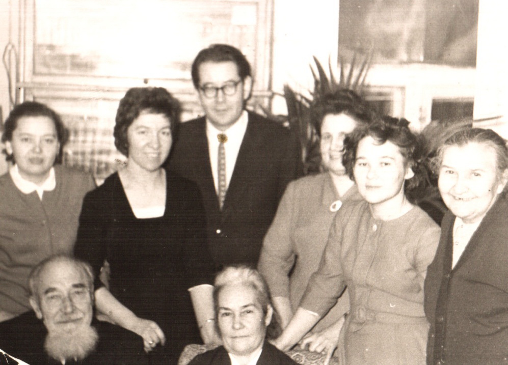 На юбилейном вечере Н.И. Воробьева. 1964 г. Сидят – Н.И. Воробьев, Д.Г. Вазеева. Стоят – Р.Г. Мухамедова, Р.К. Уразманова, Н.В. Бикбулатов, А.И. Глуховцева, Г.Р. Ишмуратова, З.А. Акчурина.