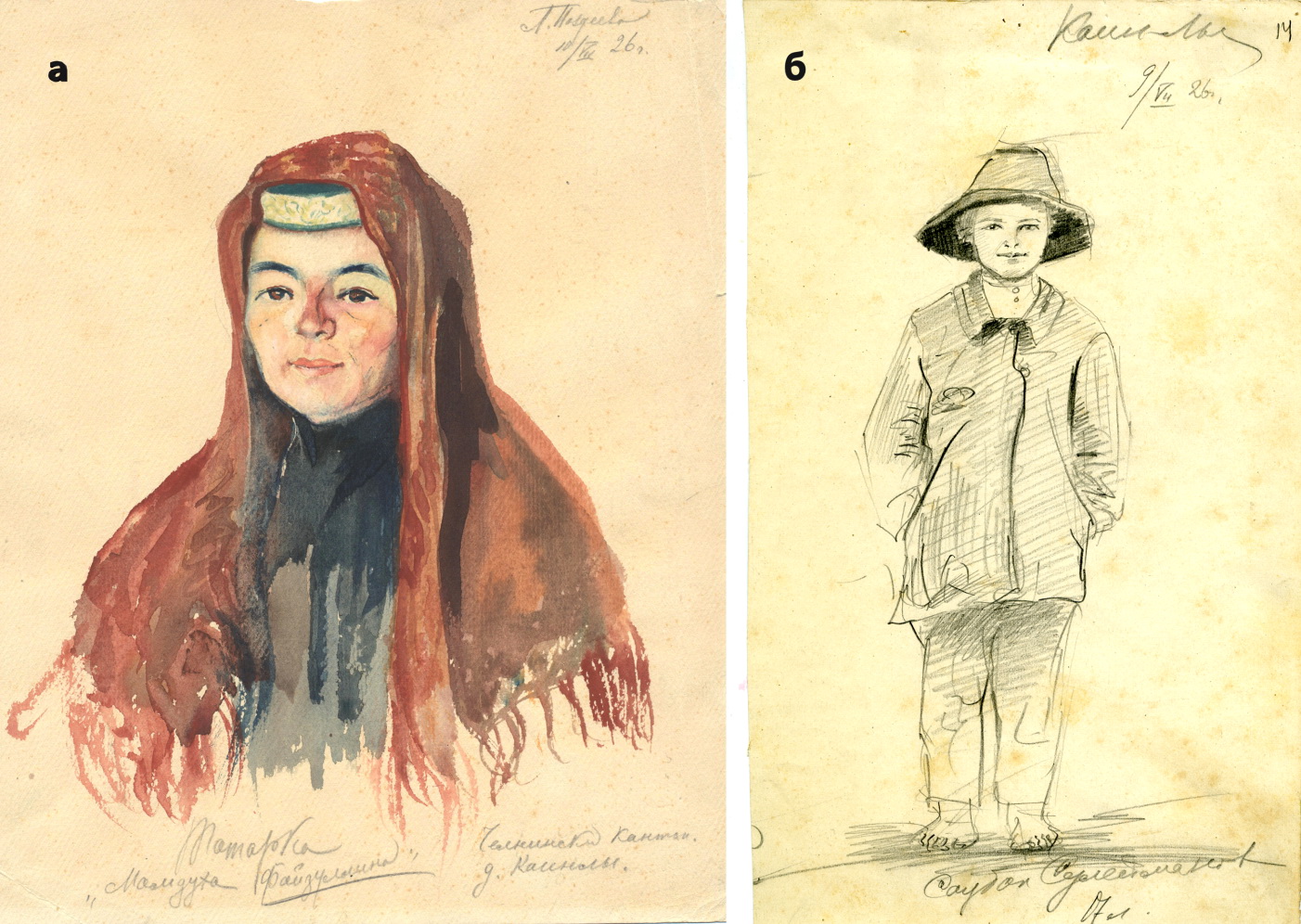 Рис. 2. а) Татарка Мамдуха Файзуллина. Д. Каинлы, Челнинский кантон ТАССР. 10.07.1926. Худ. Л.М. Поздеева. НМ РТ КППи–117625. б) Саубан Сулейманов, 17 лет. Д. Каинлы, Челнинский кантон ТАССР. 9.07.1926. Худ. Л.М. Поздеева. Мирасханэ. Ф. 77. Оп. 1. Д. 70. Л. 14.