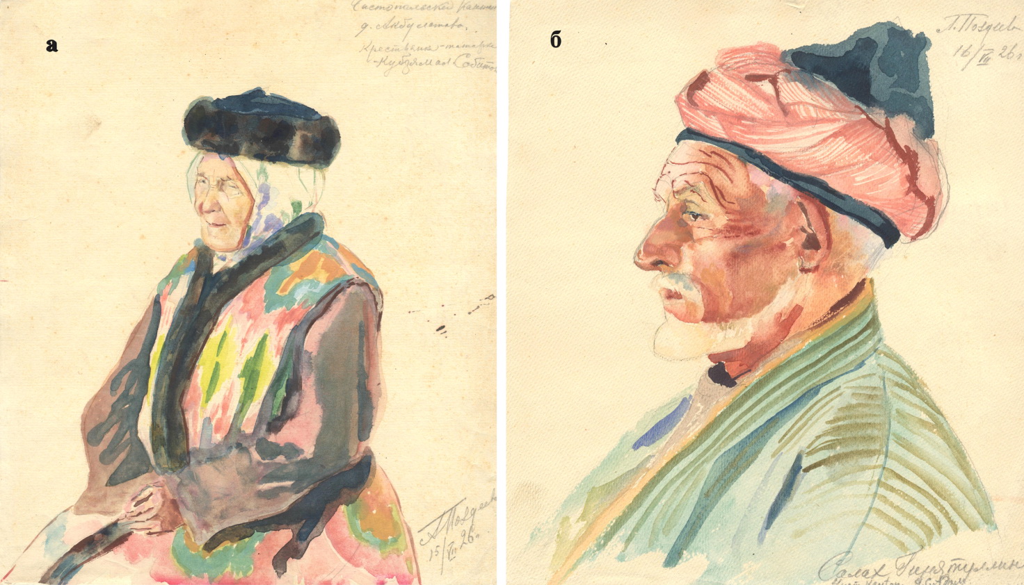 Рис. 3. а) Крестьянка-татарка Кубзямал Сабитова. Д. Акбулатово, Чистопольский кантон ТАССР. 15.07.1926. Худ. Л.М. Поздеева. НМ РТ КППи–117621. б) Салах Гинятуллин. Д. Старый Татарский Адам Чистопольский кантон ТАССР. 16.07.1926. Худ. Л.М. Поздеева. НМ РТ КППи–117626.