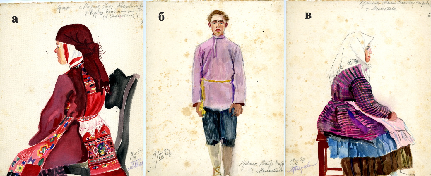 Рис. 4. а) Мария Николаевна Коновалова, 75 лет. Д. Старый Курбаш, Свияжский кантон Кайбицкого района ТАССР. 17.07.1927. Худ. Л.М. Поздеева. Мирасханэ. Ф. 77. Оп. 1. Д. 70. Л. 32. б) Кряшен Петр Егоров, 21 год. Д. Молькеево, Свияжский кантон ТАССР. 19.07.1927. Худ. Л.М. Поздеева. Мирасханэ. Ф. 77. Оп. 1. Д. 70. Л. 22. в) Кряшенка Анна Егоровна Егорова, 22 года. Д. Молькеево Свияжский кантон ТАССР. 19.07.1927. Худ. Л.М. Поздеева. Мирасханэ. Ф. 77. Оп. 1. Д. 70. Л. 23.