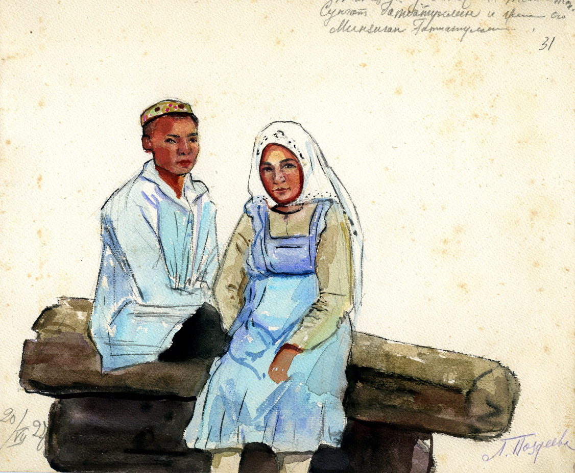 В фонде «Мирасханэ» хранится папка с экспедиционными зарисовками «Поздеева и др. Альбом этнографических рисунков (карандаш, тушь, акварель) 1921–1927 гг.», всего 35 листов (Мирасханэ. Ф. 77. Оп. 1. Д. 70.). Не на всех работах есть подписи их авторов. Среди зарисовок встречаются пейзажи, жилые и нежилые постройки, предметы хозяйственного быта, внутренний интерьер и схема жилища, изображения людей, отдельные элементы и детали костюма. Для нашего исследования, наиболее информативными являются пять работ, на которых воспроизведены жители исследуемых селений – Нижнее Бишево, Каинлы, Акбулатово, Старый Татарский Адам, Старый Курбаш, Молькеево, Бакорчи (Бакрчи). Каждый рисунок имеет авторскую подпись, имя изображенного, нередко, возраст и место, где он был выполнен (Мирасханэ. Ф. 77. Оп. 1. Д. 70. Л. 14, 22, 23, 31, 32). Из общего ряда выделяется акварель, где изображён интерьер деревенского дома и женщина, работающая на ткацком станке (Мирасханэ. Ф. 77. Оп. 1. Д. 70. Л. 10).