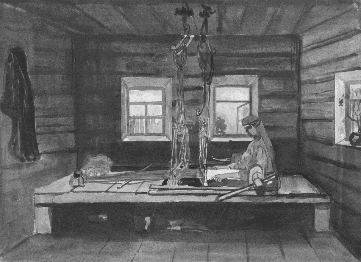 Рис. 6. Ткацкий станок без рамы. Худ. Л.М. Поздеева. Мирасханэ. Ф. 77. Оп. 1. Д. 70. Л. 10.