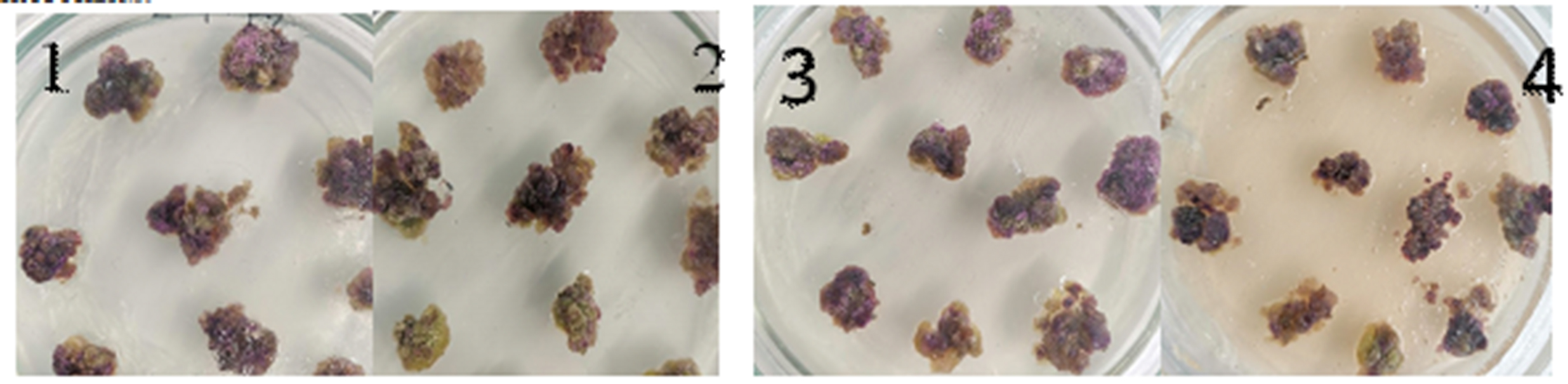 Каллус был получен на средах с различными концентрациями и соотношением ауксинов – 2,4-дихлорфеноксиуксусной (2,4-Д) и β-индолилуксусной кислот (ИУК), и цитокининов (БАП): 1 мг/л 2,4-Д; 2 мг/л 2,4-Д; 3 мг/л 2,4-Д; 3 мг/л БАП+0,3 мг/л ИУК (Гвоздикова А.М. и др., 2023).