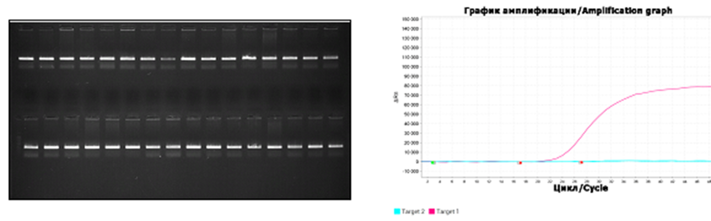 Данные тест-системы были модернизированы при помощи метода РВ-ПЦР. Примеры получаемых результатов представлены на рис. 1 и 2.