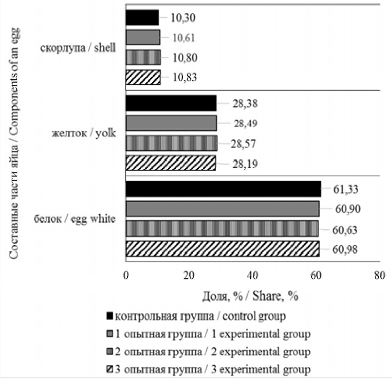 Процентное соотношение составных частей яйца (рис. 3) соответствовало физиологической норме и не имело существенных различий по группам.