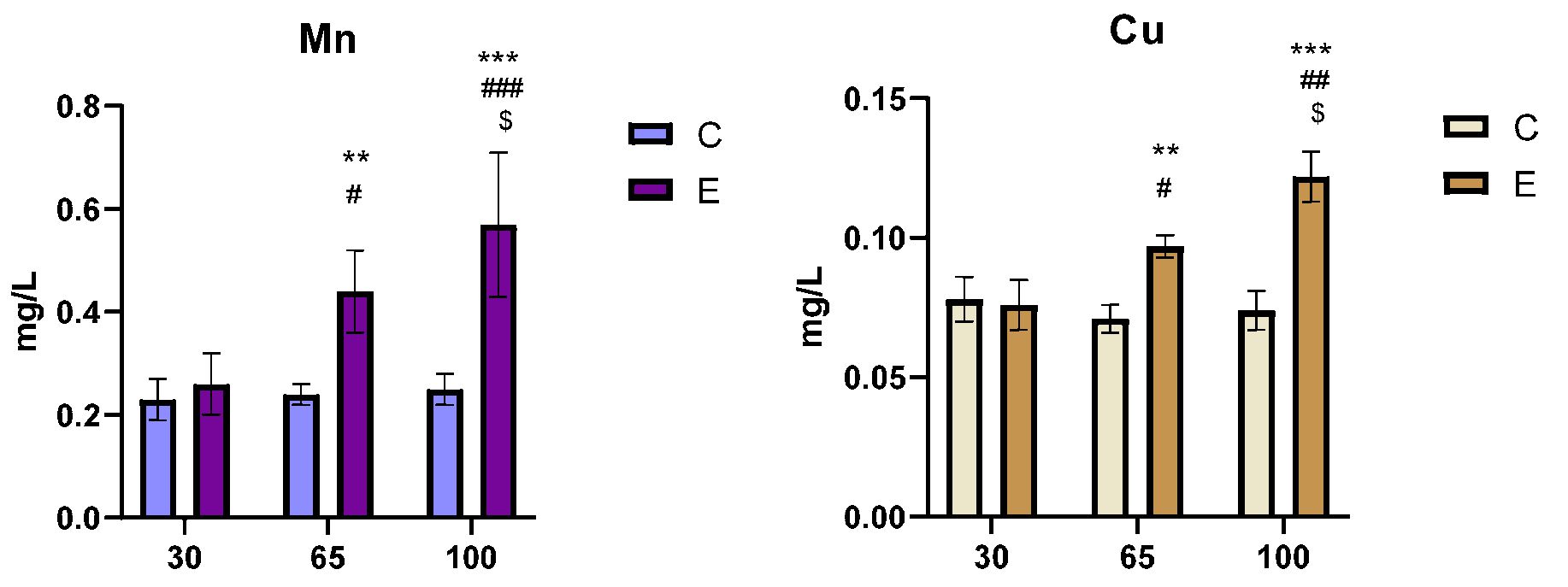 Manganese is another important mineral found in cow milk, albeit in lower concentrations compared to other minerals. It plays a role in bone formation, metabolism, and antioxidant defense. Research by Navarro-Alarcon M et al. (2011) indicates that the manganese content in milk can be influenced by the cows' diet, particularly the mineral composition of the feed they consume. The manganese content in cow milk is relatively low, with the USDA indicating levels around 0.003 mg per 100 grams (USDA, 2021). Research by Kahn SA et al. (2019) corroborates this, suggesting that cow milk is not a significant source of manganese, as its levels are much lower compared to other food sources. Pilarczyk R et al (2013) a concentration of 0.02 µg/mL in Simmental and Holstein-Friesian cow’s milk, concentration that is almost similar to our findings in control cows but lower that we observed in cows supplemented with chelated minerals in the day 65 and 100 of lactation period.