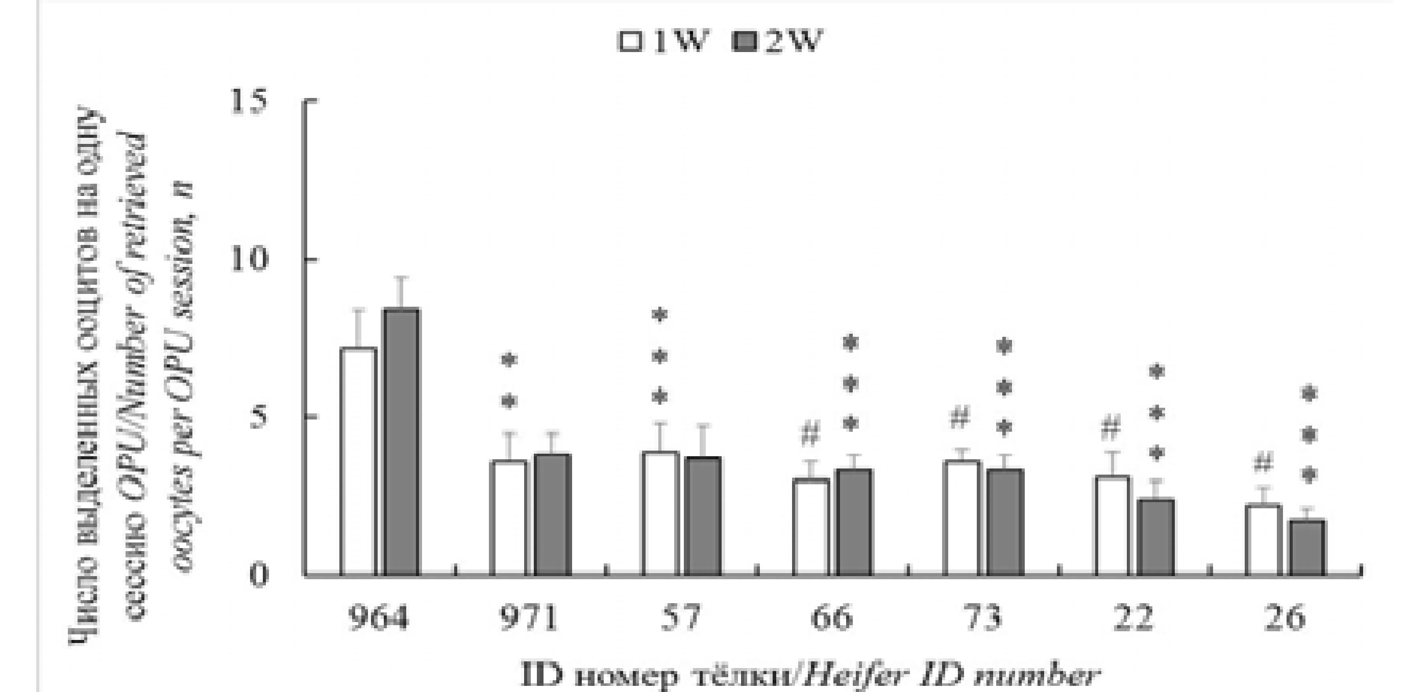 Результаты трансвагинальной аспирации фолликулов у отдельных доноров представлены на рисунке 1. Выявлена зависимость количества аспирированных фолликулов как от индивидуальных особенностей опытных животных, так и от временных параметров проведения OPU. В случае выполнения этой процедуры в режиме 2 раза в неделю (2W) у тёлки с идентификационным номером 964 среднее количество аспирированных фолликулов на 1 сессию OPU имело наибольшее значение (13,0±0,9 фолликулов) и было выше (от Р≤0,05 до Р≤0,001), чем у других 7 доноров. Минимальное количество фолликулов (5,3±0,4) пунктировано у тёлки № 26, которое было ниже не только по сравнению с тёлкой № 964 (Р≤0,001), но и в сравнении с некоторыми другими донорами (Р≤0,05). Когда OPU проводилось раз в неделю (1W) по данному показателю различия между отдельными животными были менее выражены, его максимальное (8,3±1,2 фолликула) и минимальное (4,8±0,5 фолликула) значение сохранялось за теми же телками (№ 964 и 26 соответственно) что и при 2W, и только между ними установлены достоверные отличия (Р≤0,05). У двух (№ 964 и 971) из 7 доноров при режиме 2W показатель количества аспирированных фолликулов на одну сессию OPU был существенно выше, чем при режиме 1W (Р≤0,05).