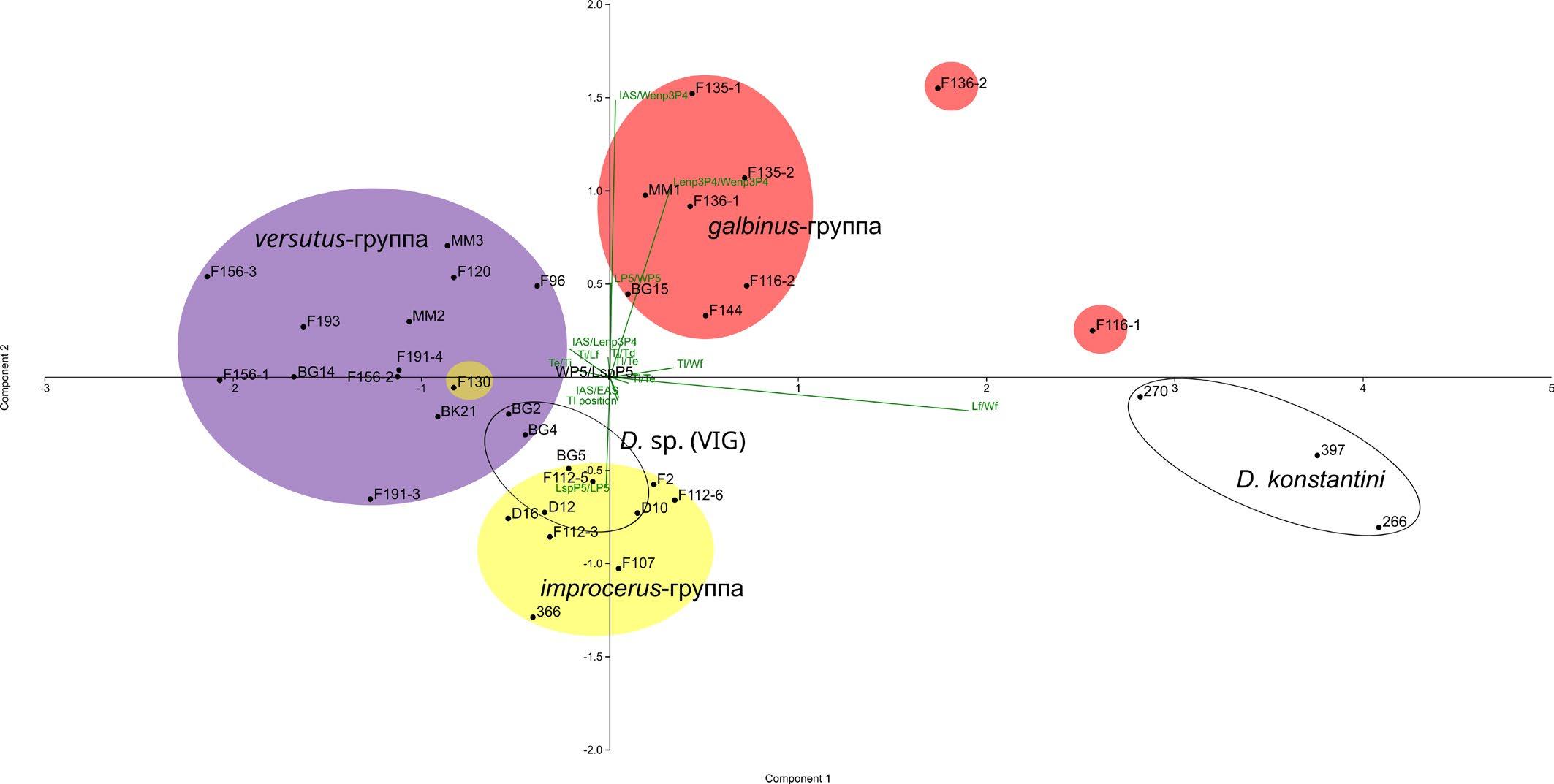 Метод главных компонент применяли к данным морфометрических индексов, полученных для 37 особей. Из них 9 особей принадлежали galbinus-группе, 12 особей - versutus-группе, 8 особей - improcerus-группе, 3 особи - D. konstantini и 5 особей D. sp. (VIG2) (BG2, BG4, BG5, D10, D12). Молекулярные данные были получены для большинства этих особей. По результатам анализа соответствий 8 морфометрических параметров, Tmi/Tme, Td/Te, Ti/Tmi, Ti/Tme, Ti/Td, LA1/Lcpht, Lтела и LseP5/LspP5, вместе объясняют 5% вариабельности первой оси (общая вариабельность - 25.6%) и были исключены из набор данных для дальнейшего анализа методом главных компонент (PCA). Более вариабельные параметры, такие как Lf/Wf, Te/Ti, Tl/Wf, Lenp3P4/Wenp3P4, IAS/EAS, расположение на каудальных ветвях Tl, IAS/Lenp3P4, IAS/Wenp3P4, Ti/Lf, Tl/Te, Ti/Td, Ti/Te, LP5/WP5, LspP5/LP5 и WP5/LspP5 были включены в анализ PCA. Первые две главных компоненты (PC1, PC2) объясняют 76,1% изменчивости морфометрических параметров. PC1 и PC2 объясняют 61,5% и 14,6% вариации. Первая главная компонента имеет сильную положительную корреляцию с пропорцией длины и ширины каудальных ветвей (Lf/Wf), менее сильную положительную корреляцию с пропорцией длины и ширины третьего эндоподита четвертой пары плавательных ног (Lenp3P4/Wenp3P4), пропорцией длины латеральной щетинки и ширины каудальных ветвей (Tl/Wf) и отрицательную корреляцию с пропорцией длин внешней и внутренней крайних апикальных щетинок (Te/Ti), а также с пропорцией длин внутреннего апикального шипа третьего эндоподита P4 и длины этого членика (IAS/Lenp3P4). Вторая главная компонента имеет сильную положительную корреляцию с пропорцией длины внутреннего апикального шипа третьего эндоподита P4 и ширины данного членика (IAS/Wenp3P4) и с пропорцией длины и ширины третьего эндоподита P4 (Lenp3P4/Wenp3P4), менее сильную положительную корреляцию с отношением длины и ширины дистального членика P5 (LP5/WP5) и отрицательную корреляцию с отношением длины апикального шипа P5 и длины дистального членика P5 (LspP5/LP5) (Рис. 4). Результаты PCA и молекулярной филогении согласуются в разделении генетически отдаленных видовых комплексов Diacyclops. Вдоль оси первой главной компоненты расположены D. konstantini и представители versutus-группы, тогда как представители galbinus- и improcerus-групп, с D. sp. (VIG2) расположены главным образом вдоль второй главной компоненты. Особи D. sp. (VIG2) наиболее близки к improcerus- и versutus-группам. Особи F130 (IX) improcerus-группы и F156-2 (V) перекрываются с особями versutus-группы. Особь F116-1 (I) galbinus-группы наиболее близка D. konstantini, чем к galbinus-группе. Метод главных компонент не позволяет ясно разделить все близкородственные генетические линии. Однако, особи F156-3 (VI) и F156-1 (VI) отличаются от других представителей versutus-группы наименьшей пропорцией длины и ширины каудальных ветвей и занимают крайнее положение вдоль PC1.