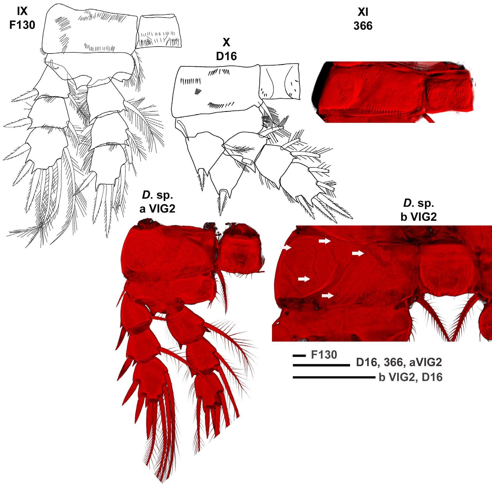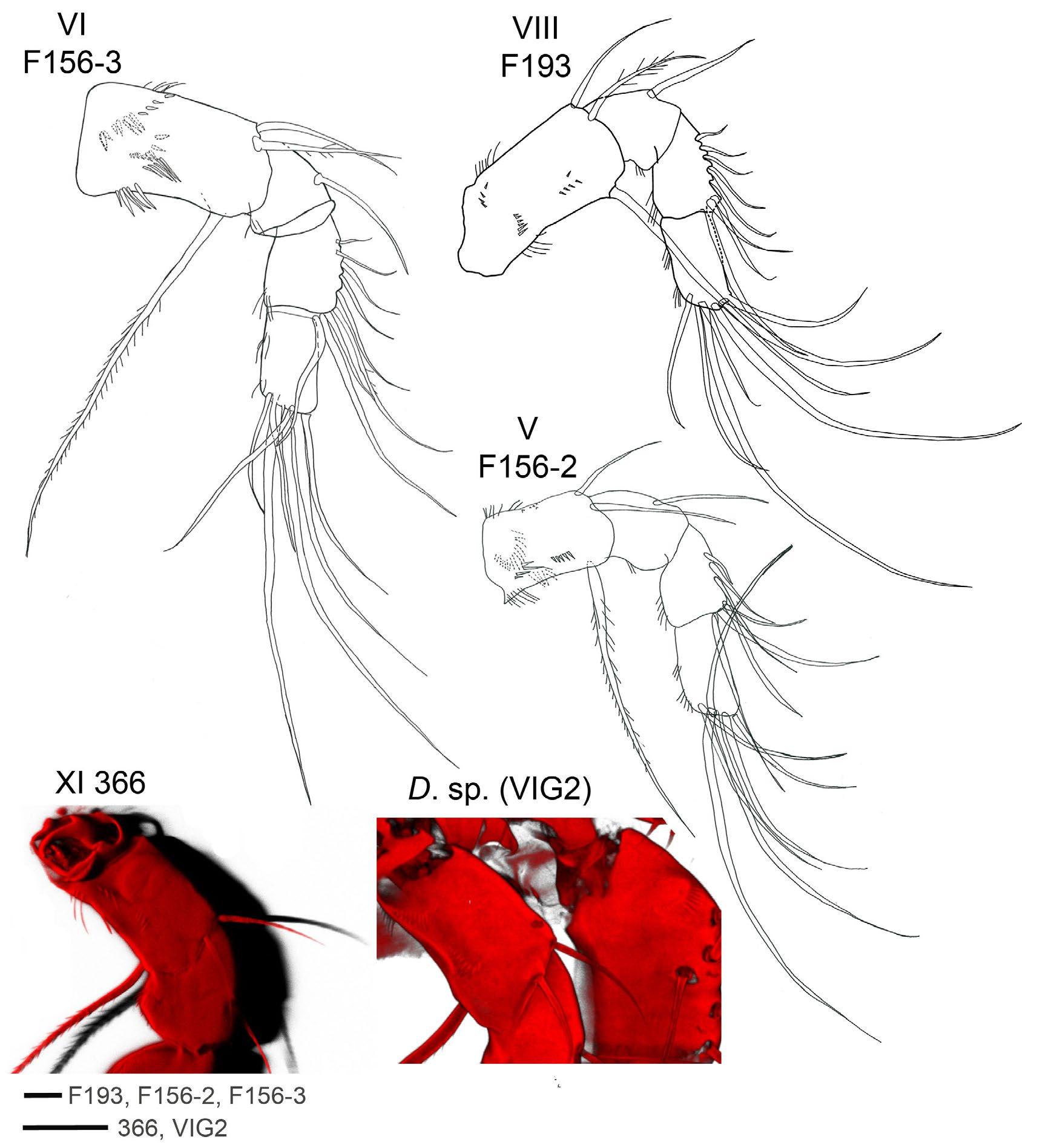 Особи D. konstantini и F156-2 (V) генетически близки и отличаются от versutus-группы в вооружении Enp3P4. Они имеют два шипа и три щетинки. У особи F156-2 (V) соединительная пластинка P4 несет два ряда длинных шипов. Базиподит A2 особи F156-2 (V) орнаментирован двумя рядами шипов и группой мелких шипиков на каудальной поверхности, двумя рядами тонких шипов на проксимальной части фронтальной поверхности и тонкими шипами вдоль обеих боковых поверхностей и вооружен двумя голыми щетинками и экзоподальной щетинкой с сетулами (Рис. 5, 6). Второй эндоподит антенны несет семь щетинок.