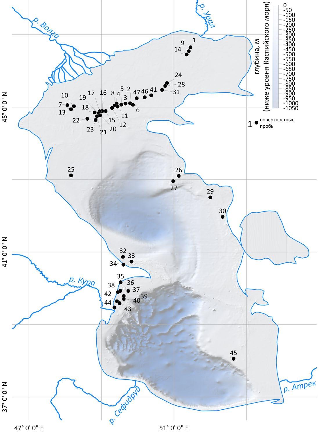 According to Gofman (1966), a total of 900 samples were initially taken from 300 sampling sites (three samples from each site), but the author received significantly reduced collection. Over the past decades, some of the samples were partially or completely lost, therefore, the quantitative analysis in this study was replaced by a qualitative one. As large areas of the Caspian Sea are shallow, especially in the northern part of the sea nearby Russian shore, we studied the near-shore zone. It includes sampling sites, where water depth is less than 50 m. A total of 45 near-shore sampling sites were studied, where the largest number of ostracod shells have been preserved (Fig. 1, 2).