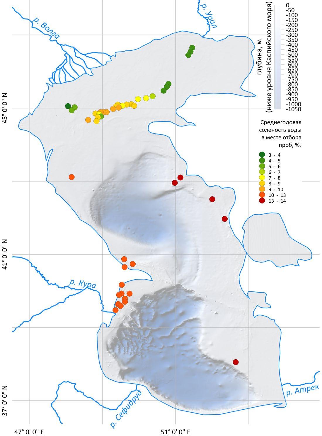 Here we present summarized data on our results of studying 45 near-shore sampling sites (Fig. 1) combined with published data, which was the first one to investigate the distribution of recent ostracods in the Caspian Sea and to discuss the influence of such factors as bottom sediments type, water temperature and salinity (Gofman, 1966; Schornikov, 1973; Yassini, 1986; Chekhovskaya et al., 2014). For each sampling site water depth, mean annual bottom water temperature and salinity at the time of sampling are available. This data is presented in Fig. 2, 3, 4.
