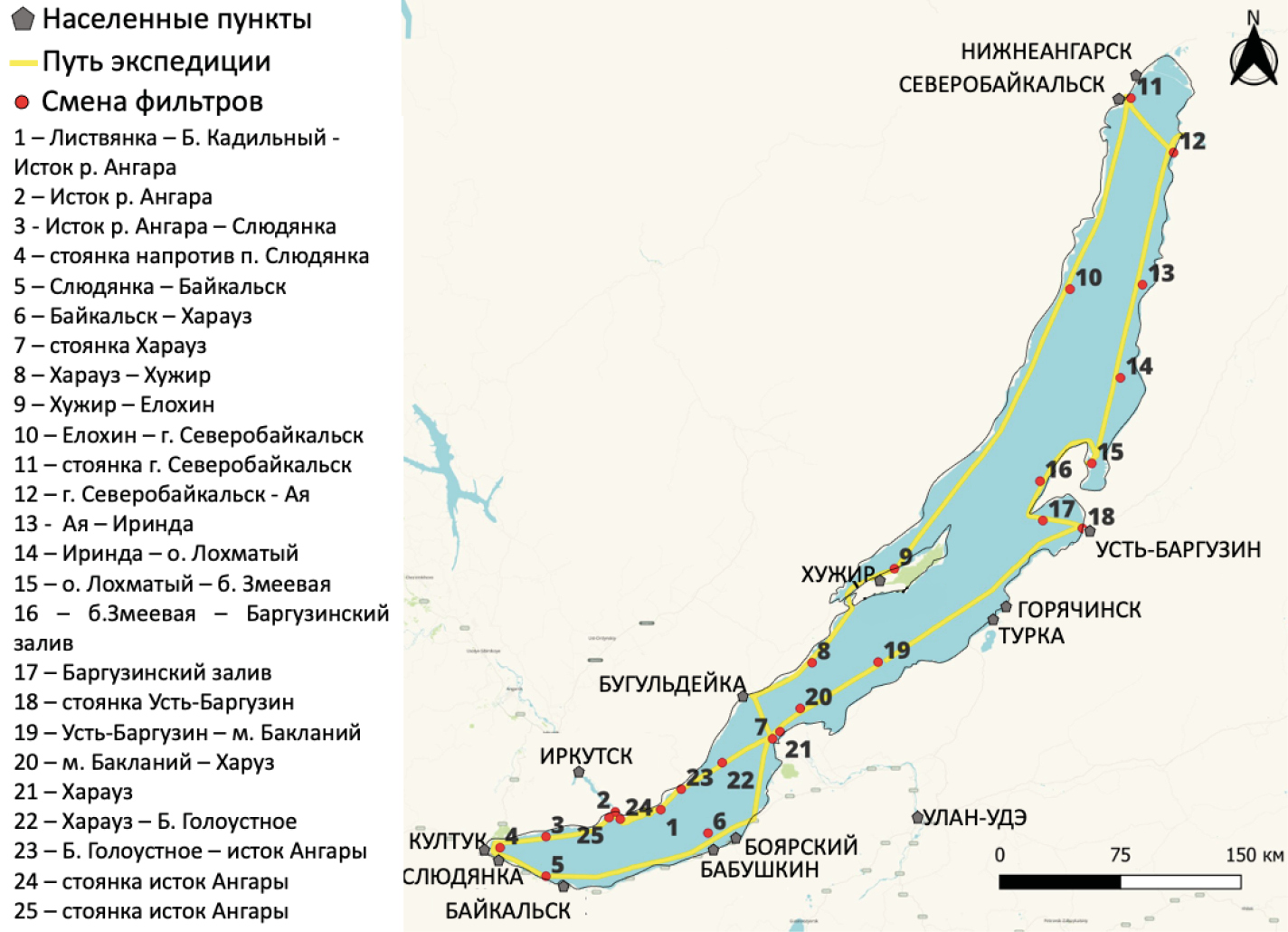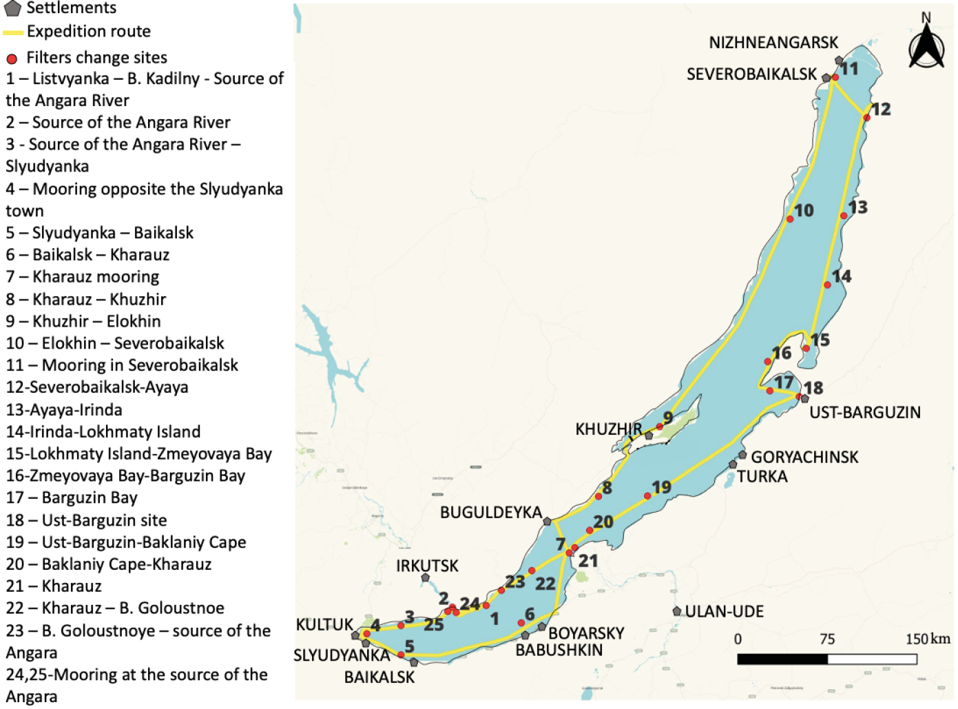 Для оценки вклада антропогенных источников Прибайкалья и опасных природных явлений (лесные пожары) в загрязнение атмосферы над оз. Байкал с 5 по 15 августа 2023 г. с борта научно- исследовательского судна “НИС Верещагин” проведены непрерывные измерения счетной и массовой концентрации аэрозольных частиц, газообразной элементарной ртути, отобрано и проанализировано 25 образцов аэрозоля на содержание ПАУ. Маршрут экспедиции проходил по всему периметру озера Байкал с остановками в районах крупных локальных источников загрязнения атмосферы на побережье озера, устьевых участках крупных притоков и заливах (Рис. 1).